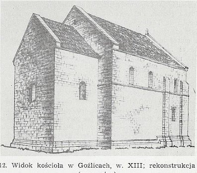 Plan, rysunek detali i rekonstrukcje, z pracy: Jamroz J., Kościół parafialny w Goźlicach. Ze studiów nad architekturą romańską w Polsce, „Folia Historiae Atrium”, t. 13,1977, s. 5-18.