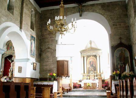 Wnętrze nawy z okienkami romańskimi i ścianą tęczową.