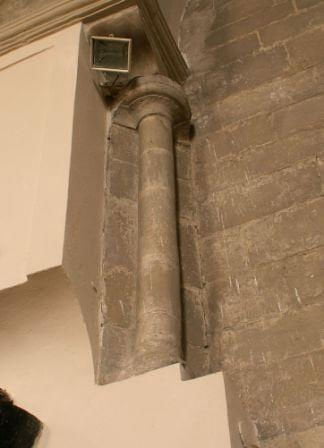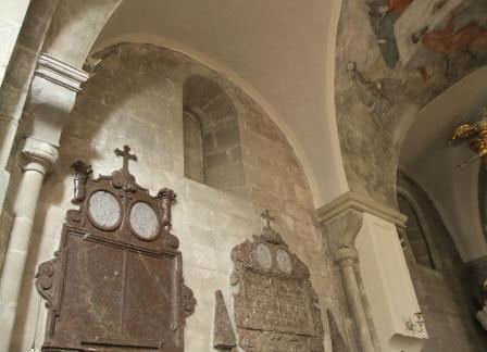 W południową ścianę gotyckiej kaplicy wmurowano wtórnie romańską płaskorzeźbę przedstawiającą ukrzyżowanego Chrystusa i narzędzia męki, m.in. patibulum (poprzeczną belkę krzyża) i flagrum (bicz z ołowianymi ciężarkami). Bardzo miły ksiądz nie robi problemów ze zdjęciami. (fot. wrzesień 2012)