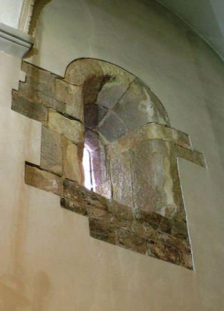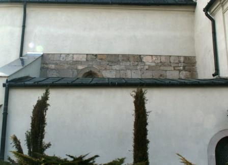 Spod tynku widoczny jest jedynie mały fragment tej ściany z rozglifionym obustronnie okienkiem, w większości zasłoniętym przez dobudówkę. W całości okienko widać od wnętrza kościoła, podobnie jak zamurowany portal w ścianie południowej.