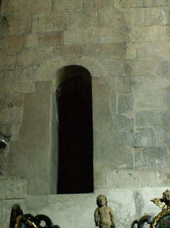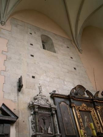 Wnętrze prezbiterium (dawniej nawy) widać okienka północne i portalik wiodący na emoprę