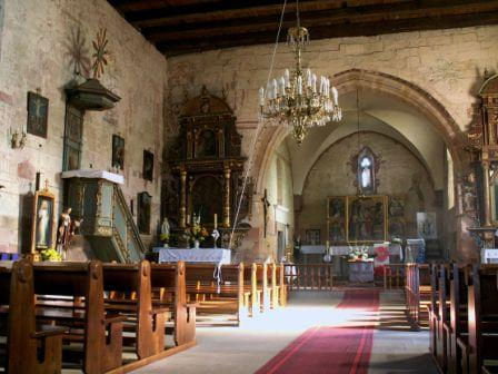 We wnętrzu zachowany łuk tęczowy już o łuku ostrym, zdobiony guzami. W południowej ścianie prezbiterium piscina.