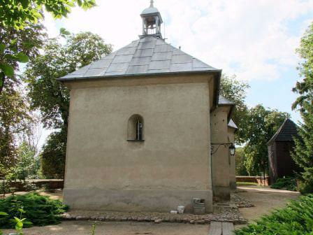 Zachowane są mury zewnętrzne (otynkowane) bez ściany zachodniej; w ścianie wschodniej prezbiterium pierwotne okno, pozostałe okna i portal przemurowane bądź zamurowane. Łuk tęczowy półkolisty, zamurowany.