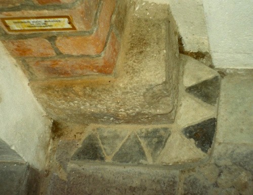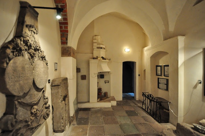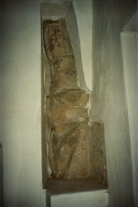 Głowica kolumny, okno, którego datowania nie znam, nagrobek romański i kilka zabytków zarośniętych pajęczynami.