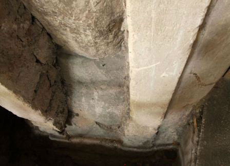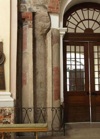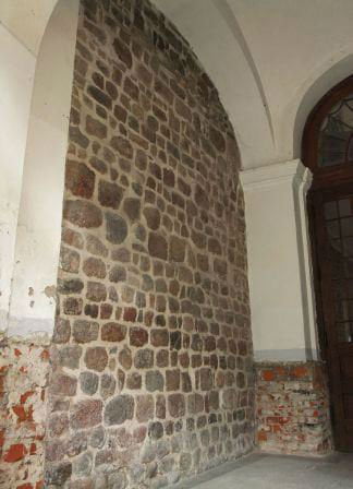 8. Początek północno-zachodniej arkady międzynawowej z fragmentem ściany nawy głównej powyżej - widok z obecnej empory przed organami.