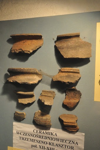 Romańska kamienna płyta nagrobna z krzyżem procesyjnym (przedostatnie zdjęcie czcibora powyżej) powstała w końcu XII lub w XIII w. Została ona odkryta w 1972 r. - jako wtórnie użyta - w budynku przy placu Kosmowskiego nr 6 i przeniesiona na wystawę. Uszkodzenie środkowej partii płyty w formie głębokiego wcięcia - zapewne służyła wtórnie jako podstawa rynny (?).