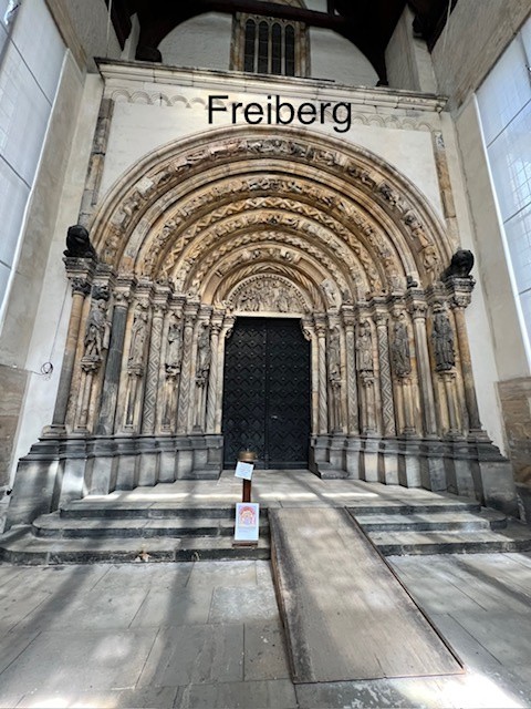 Portal katedry we Freibergu, zwany „Złotą Bramą”, jest wybitnym dziełem sztuki późnego okresu romańskiego. Aby zabezpieczyć znaleziska srebra we Freibergu i późniejsze wydobycie, zbudowano zamek, dzisiejszy zamek Freudenstein, a miasto Freiberg rozwinęło się w kwitnącą społeczność. Pod koniec XII wieku zbudowano kościół Marienkirche jako kościół parafialny. Była to późnoromańska bazylika filarowa, której zachodni portal, zbudowany około 1225/30 roku, musiał być widoczny z dziedzińca zamkowego. Oryginalnie zabarwiony portal charakteryzuje się niezwykłą urodą – jego program obrazkowy niczym w otwartej Biblii wyjaśnia podstawowe idee nauczania chrześcijańskiego.
