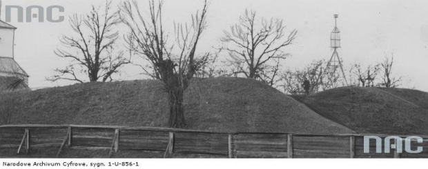 Widok góry zamkowej w Dawidgródku od strony miasta. Widoczne dawne wejście do grodu i fragment walu obwodowego na fotografii z okresu międzywojennego