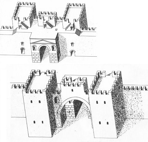 Brama Południowa - rekonstrukcje od strony wnętrza miasta (u góry) i od zewnątrz (na dole). Od wnętrza widać trójkątny fronton i nisze, od zewnątrz - dodatkowy monumentalny łuk podtrzymujący basztę nadwieszoną (propugnaculum)