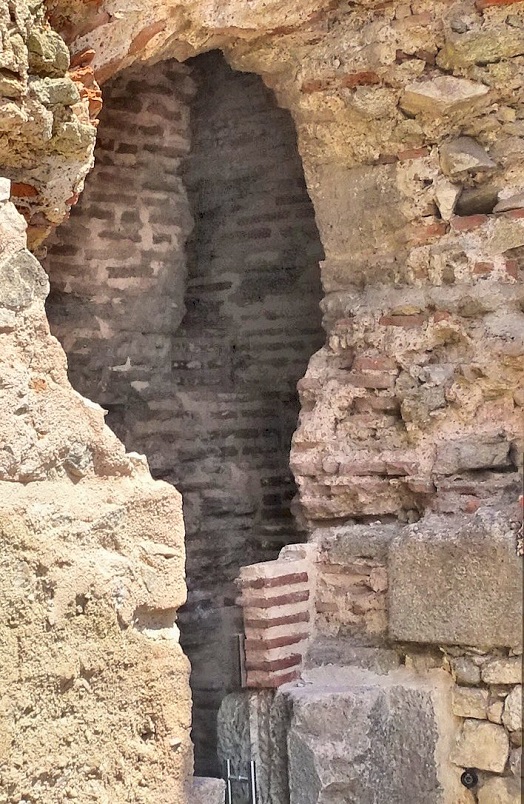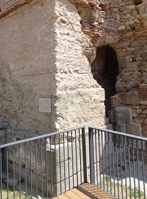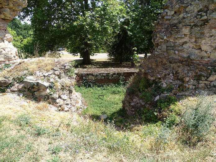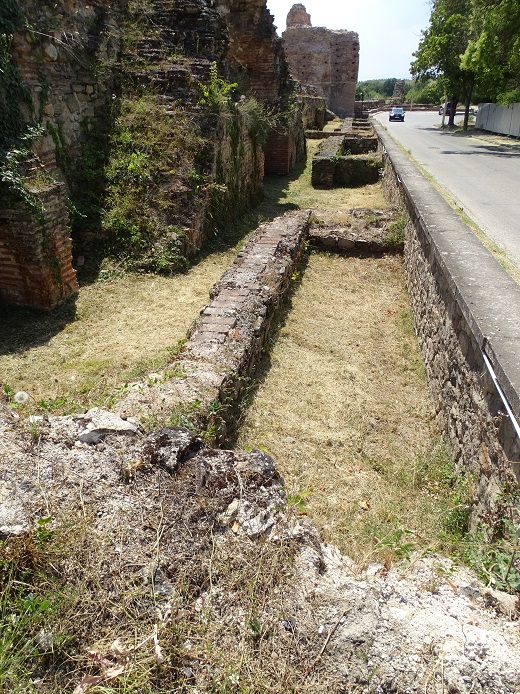 Wewnętrzna strona murów południowych na zachód od Bramy Południowej. Widać fundamenty koszar dobudowane do muru w 2 poł. IV w., a na nich dolne partie bazyliki wczesnochrześcijańskiej (kościół nr 1) z poł. V w.