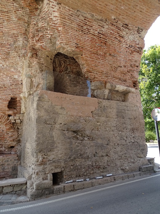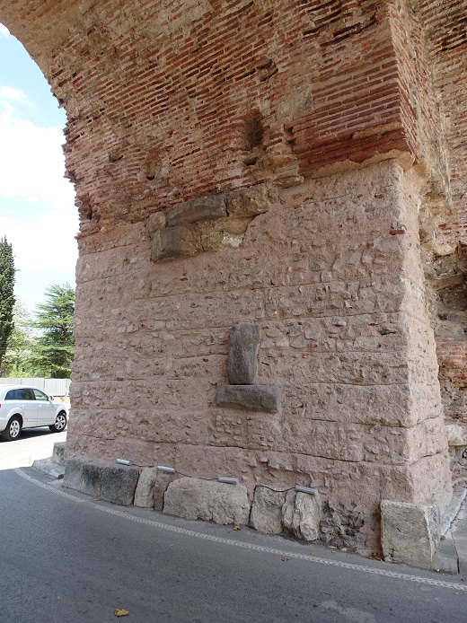 Łuk poza funkcją monumentalną (Porta Triumphalis) podtrzymywał basztę nadwieszoną (pozostał z niej mały, przerwany łuk u góry)