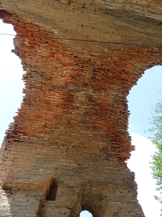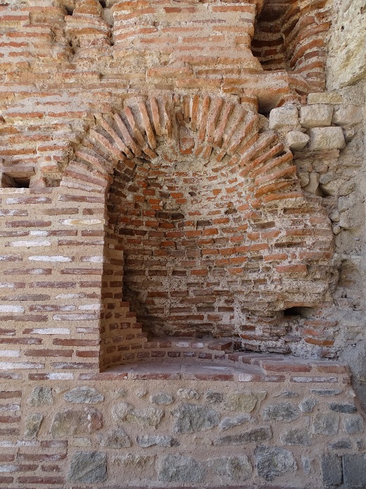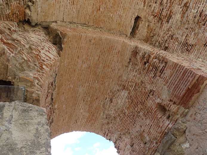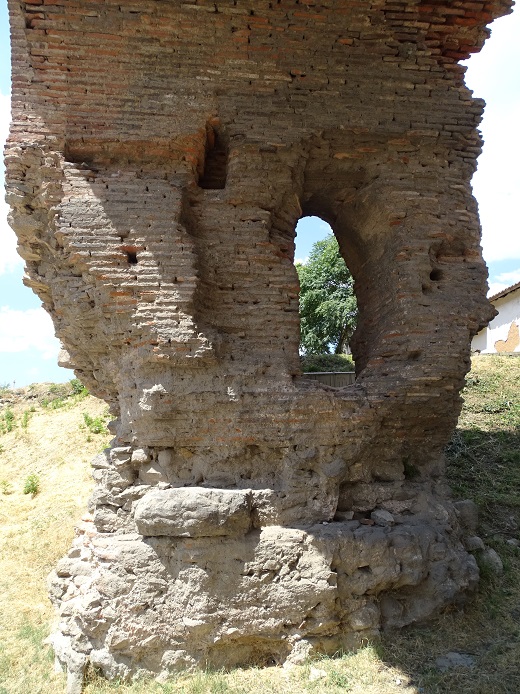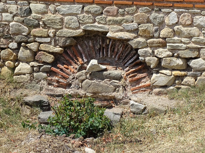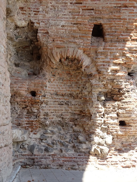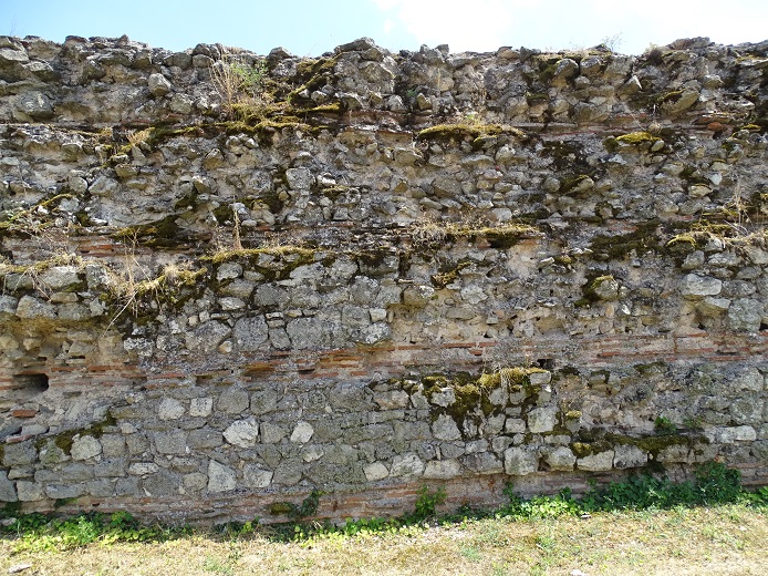 Zewnętrzne lico muru południowego. Opus mixtum - kamienie spajane zaprawą przedzielone kilkoma pasami cegieł przechodzącymi przez całą grubość muru