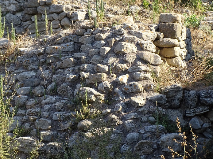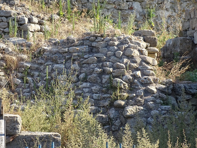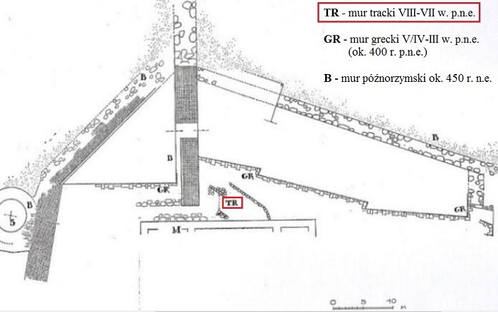 W środku mur tracki - VIII-VII w. p.n.e. Po prawej fragment jego bramy przecięty murem późnorzymskim (ok. 450 r. n.e.) zamykającym prawą stronę kadru