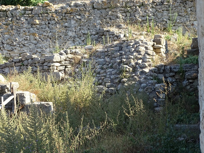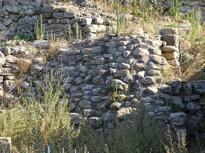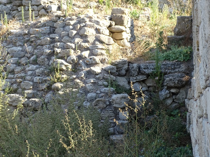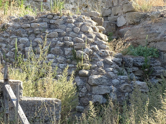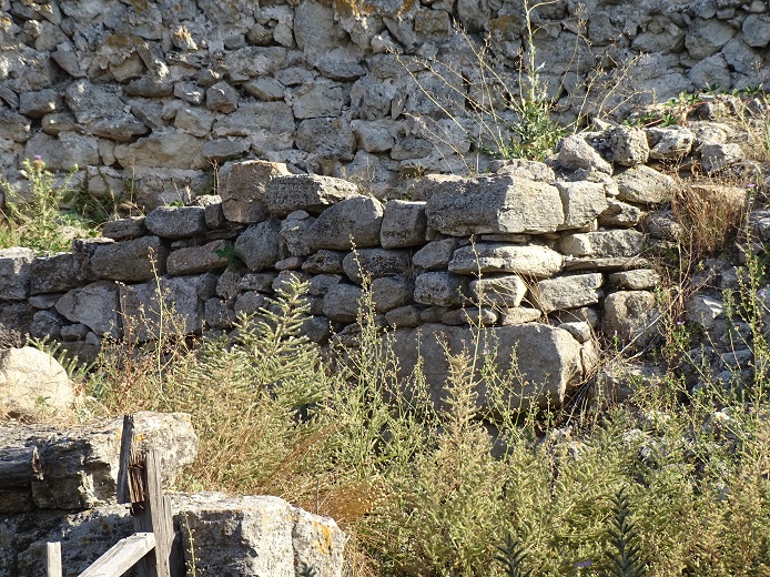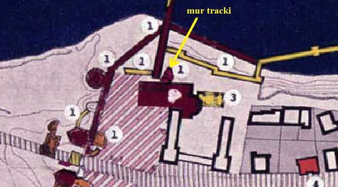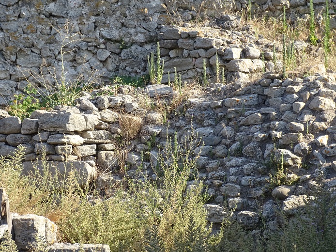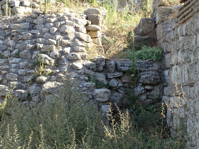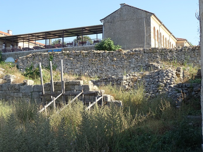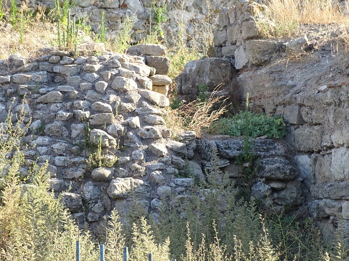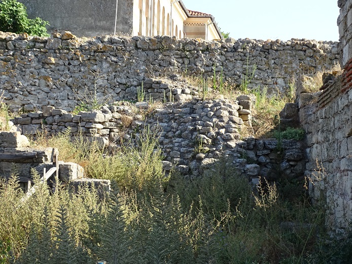 Widok na tyłach parkingu przy porcie północnym. Na pierwszym planie (na dole po lewej, podparty rusztowaniem) mur grecki (V/IV w. p.n.e.), w środku po prawej - mur tracki (VIII-VII w. p.n.e.), na trzecim planie północna ściana bazyliki wczesnochrześcijańskiej (V w. n.e.). Ponad nimi współczesna restauracja.
