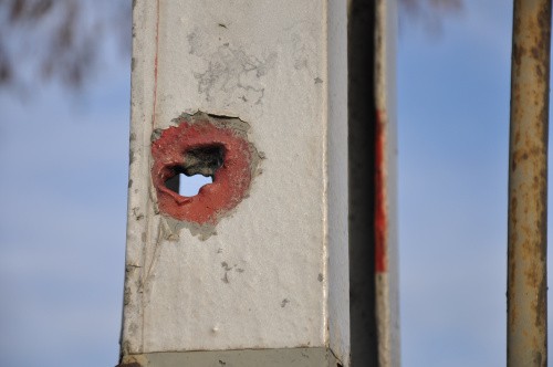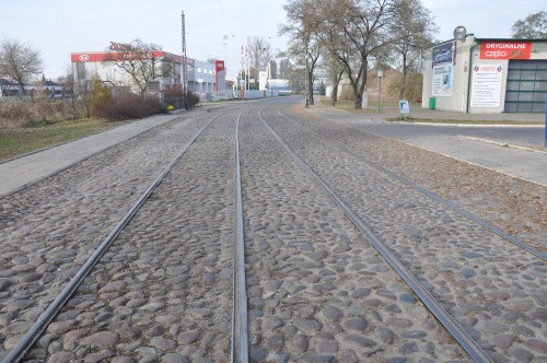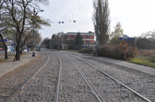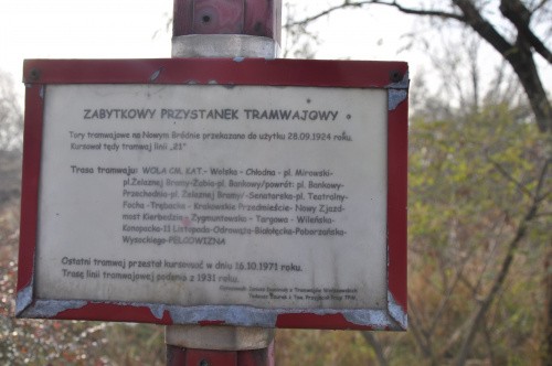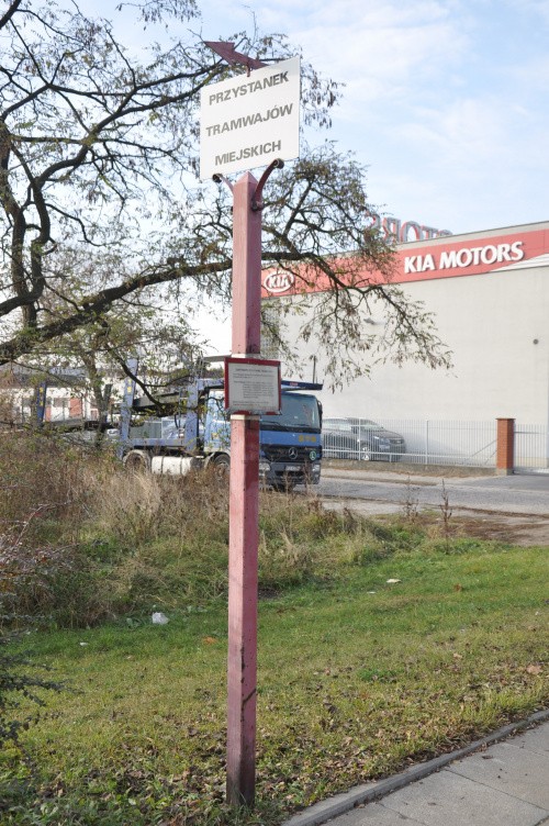 Już nieczynna, zachowane oryginalny przedwojenny przystanek, ulica, tory, słupy trakcyjne ze śladami kul