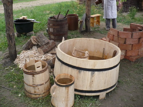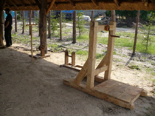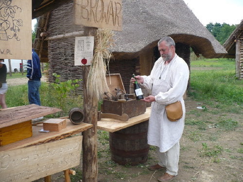 Pokazy dawnych rzemiosł odbywały się w chatach lub obok nich. Można było obejrzeć pokaz kowalstwa, garncarstwa, czerpania papieru, wyszywania, powroźnictwa, druku na maszynach wzorowanych na tych z czasów Gutenberga, bednarstwa, wytwarzania bębnów, witraży, była chata zwykłych ludzi, pokaz orki, był cyrulik i pokaz warzenia piwa. Największe zainteresowanie budził pokaz czerpania papieru i warzenia piwa. Oprócz bardzo bogatej prezentacji rzemiosła, był również pokaz walk rycerskich, które były w formie zainscenizowanych sytuacji. Rycerzy nie było dużo, ale byli barwni i budzili bardzo duże zainteresowanie. Na zakończenie w sobotę brali udział w przedstawieniu teatralnym (niestety musiałem wracać i nie obejrzałem). Sztuka oczywiście w formie i treści nawiązywała do średniowiecza.