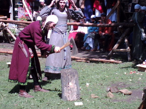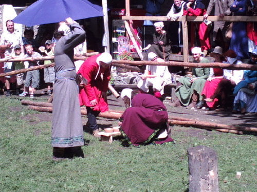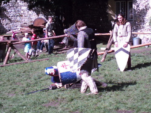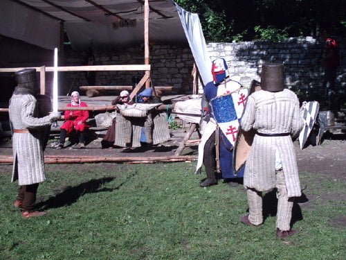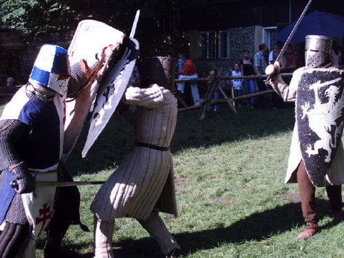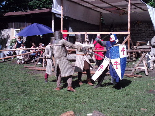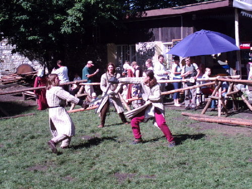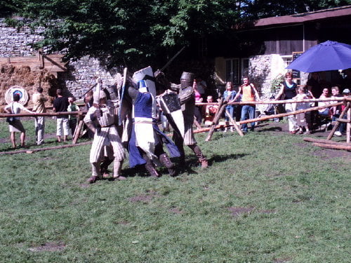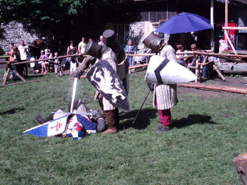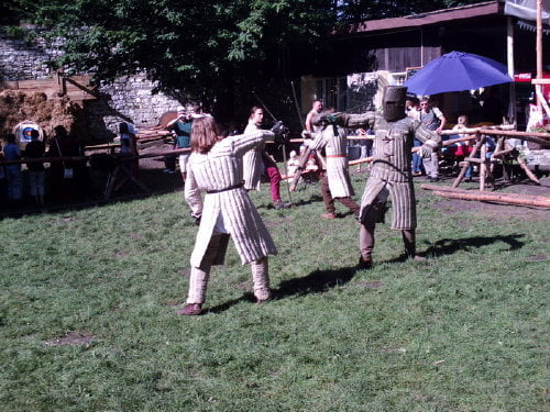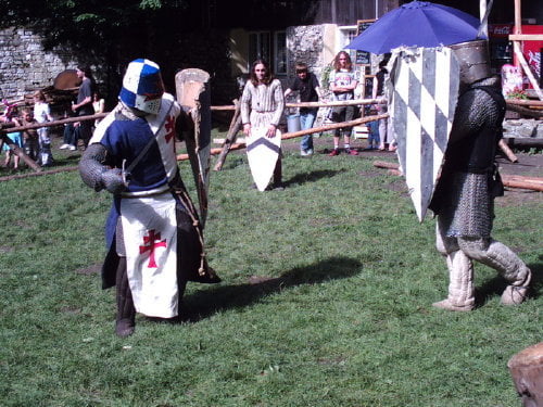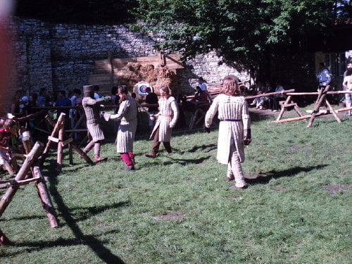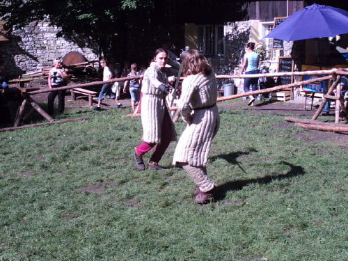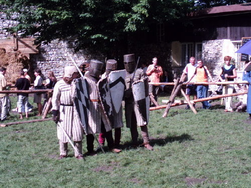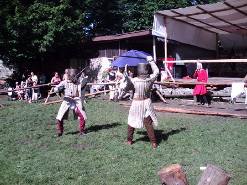 Tradycyjnie dotarłem na samą końcówkę turnieju, a właściwie na ostatnią konkurencję, czyli pojedynki „par”. Z powodu braku chętnych były dwie normalne pary i dwie męskie. Najpierw partner miał przebiec slalom z partnerką na plecach, później on obrać jabłka, ona porąbać drewno a wspólnie mieli przebrać nasiona. Normalne pary starły się i dobrze im to szło. Pary męskie natomiast miały raczej rozbawiać niż rywalizować. W jednej parze kobieta wszystko musiała zrobić za męża, w drugiej odwrotnie, żona hetera pomiatała mężem. Oczywiście wszystko z zabawnymi dialogami i dużym humorem. Można było się ubawić. Po zmaganiach par rozdano nagrody dla zwycięzców poważniejszych konkurencji z dnia poprzedniego i zakończono oficjalnie turniej. Na szczęście odbyła się później część nieoficjalna, poza turniejowa. Były to walki w różnych konfiguracjach. Było czterech lekkozbrojnych i jeden, rycerz ciężkozbrojny, Bandit. Lekko zbrojni toczyli pojedynki w parach, każdy na każdego, dwóch na jednego… Ciężkozbrojny walczył z czterema lekkozbrojnymi, z dwoma. Była tez zainscenizowana historyjka z wykorzystaniem najmłodszych. Historyjka jak to liczne dzieciaki pewnej pary dzielnie pokonały rabusi, którzy chcieli okraść ich rodziców. W ramach biletu można było również zwiedzać zamek. Niektóre pomieszczenia były niedostępne z powodu oddania ich do użytku uczestnikom turnieju. (nocowali na zamku). Nie ma tam wyposażenia i spali jak w epoce, którą odtwarzają. Zresztą takie było założenie, że ma być jak w średniowieczu. Tego im zazdroszczę. Kameralny i bardzo klimatyczny turniej.