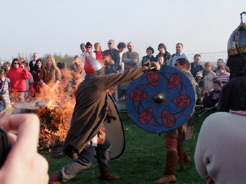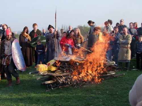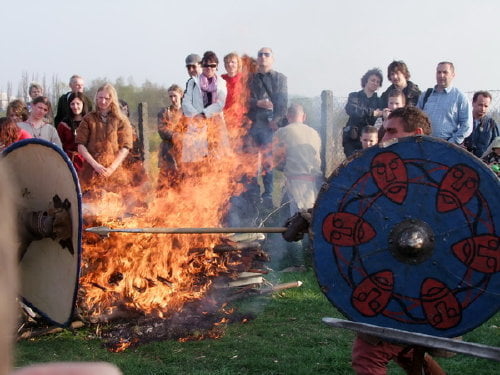 Ponadto była efektowna inscenizacja spalenia obozowiska i na koniec pokaz obrządków pochówku. Obok siebie, w tym samym czasie odbył się pogański obrządek tryzny i chrześcijański pochówek. Między uczestnikami obydwu pochówków dochodziło do ciągłych utarczek słownych. Większe zainteresowanie wzbudziła tryzna, bo jest widowiskowa. Zapłonął wielki stos, obok którego wojowie toczyli pojedynki. Na pogrzebie chrześcijańskim zaś jedynie zakopywano „zwłoki” w ziemi. Nad grobem mowę wygłaszał ksiądz (mocny element pogrzebu chrześcijańskiego). Pomysł z równoległymi pochówkami ciekawy i dobry. Jedynie trochę lepiej powinno to być zorganizowane. Obydwa pochówki powinny być odgrodzone od publiczności tak żeby widzowie nie mogli wchodzić między dwie inscenizacje.