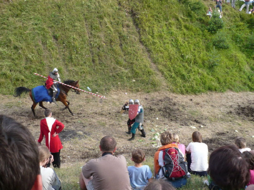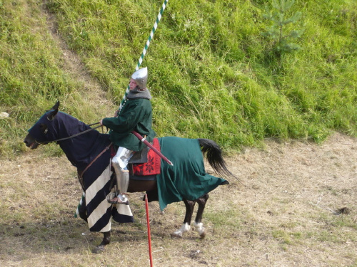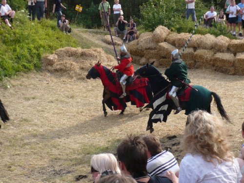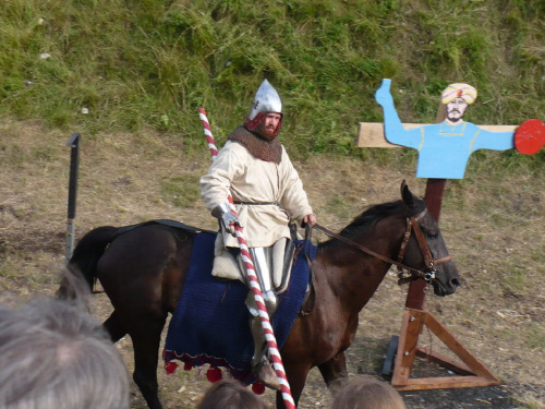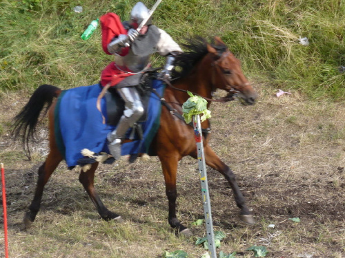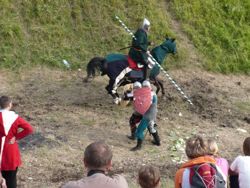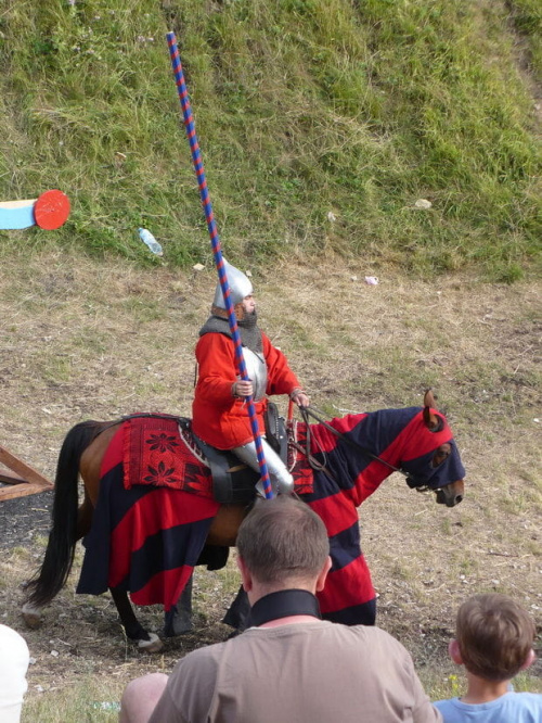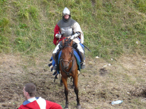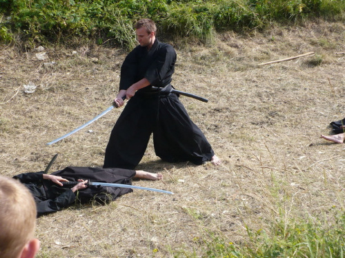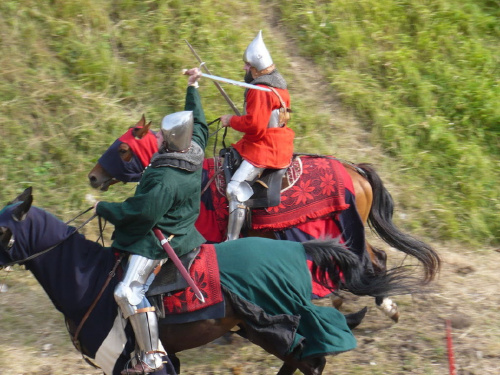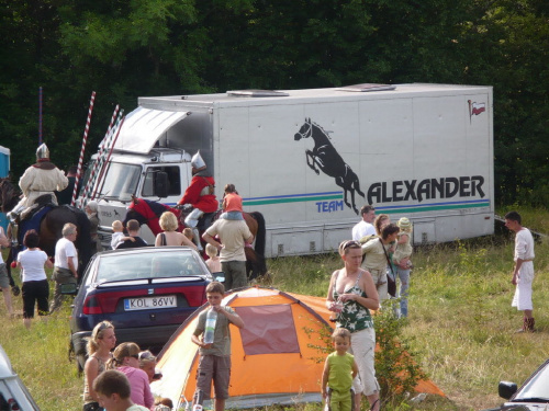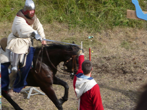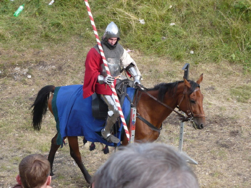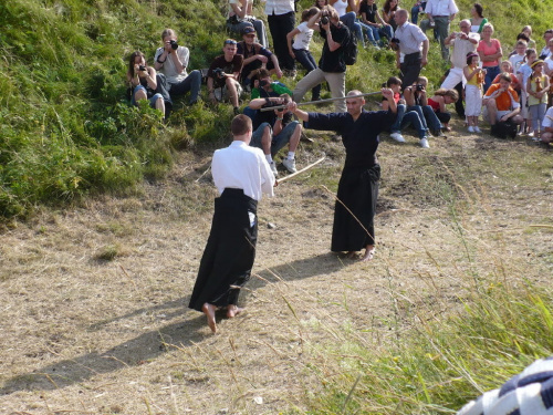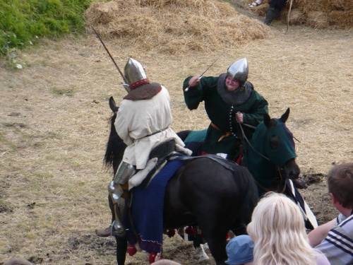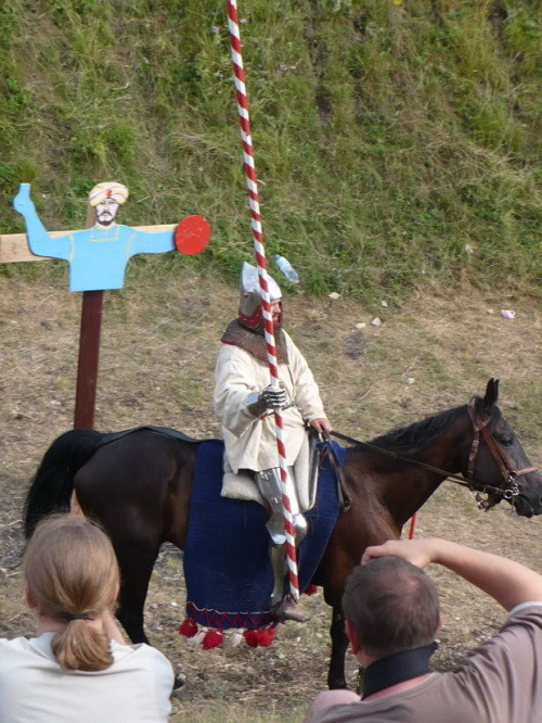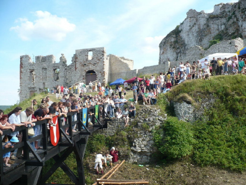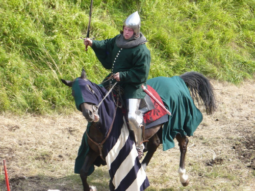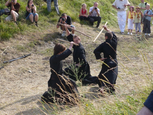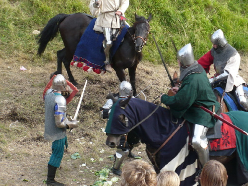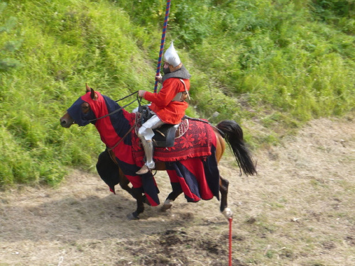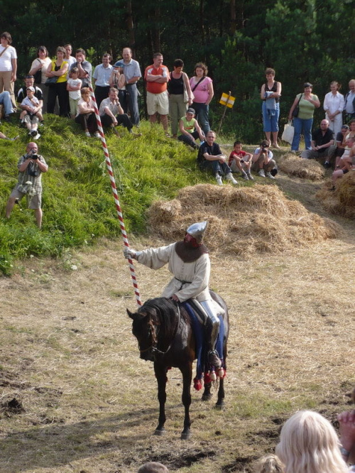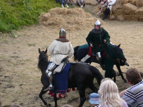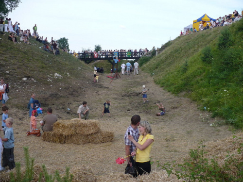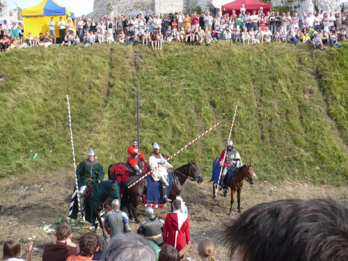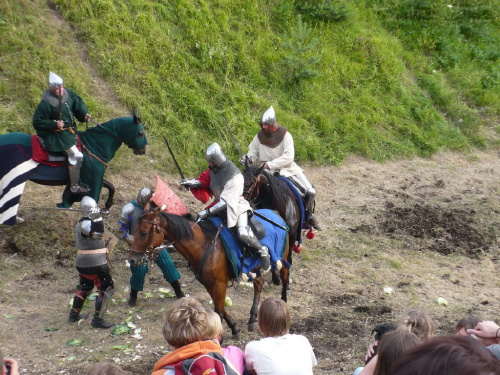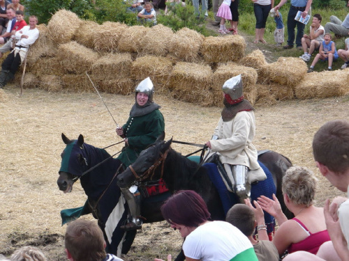 Na turniej udało mi się dotrzeć w niedzielę, na dwa ostatnie punkty programu. Był to pokaz Kendo i Iaido oraz pokazy konne rycerzy. Później był jeszcze koncert folkowego zespołu Banshee (folk irlandzki), ale niestety nie mogłem zostać. Arena zmagań turniejowych umiejscowiona była w fosie. Ludzie siedzieli na zboczach jak w amfiteatrze, stali też na moście. Pokaz Iaido i Kendo był prezentowany przez członków szkół z Olkusza i Krakowa. Brali w nim udział, między innymi: mistrzowie polski i mistrz europy, co gwarantowało bardzo wysoki poziom. Pokazywano jak wyglądały ćwiczenia, i inscenizowano scenki. W przypadku Iaido były to niespodziewane ataki na siedzącego samuraja. Był też pokaz walki kijem przeciwko samurajowi uzbrojonemu w miecz. Na koniec był pokaz walk Kendo według zasad obecnie stosowanych na światowych turniejach. Później chwila przerwy i w fosie pojawiło się czterech rycerzy na koniach. Pokazy zręczności zaczęli od zbierania mieczem pierścieni trzymanych przez giermka. Było ścinanie głów kapusty i jajek. Później była demonstracja walki piechurów z konnymi, a właściwie pokaz miażdżącej przewagi rycerza konnego nad pieszym. Jak wyjaśniał komentator, była to walka rycerzy z piechurami, bo bez konia to właściwie już nie rycerze. Na koniec po ogłoszeniu wyników turnieju doszło do sprzeczki i w konsekwencji walki na koniach między dwoma rycerzami. Po krótkiej potyczce rycerze odjechali do obozu, który znajdował się nieopodal na łące. Całość była świetnie prowadzona przez spikera. Z humorem, ale i wieloma ciekawymi komentarzami. Mimo, że widziałem tylko dwa pokazy, widać było, że turniej jest całkiem okazały. Naprawdę dużo ludzi. Poza pokazami można było nabyć różne pamiątki na straganach pod zamkiem. Był również stragan gdzie można był kupić cegiełki na ratowanie zamku i różne materiały o jego historii. A dla głodnych czy spragnionych ogródek z kiełbaskami i piwem. Jedynym powodem do narzekania było to, że nie dało się wejść na sam zamek, który jest zamknięty z powodu prac remontowych. Zdecydowanie warto się wybrać do Rabsztyna, i zdecydowanie na dłużej niż ja.