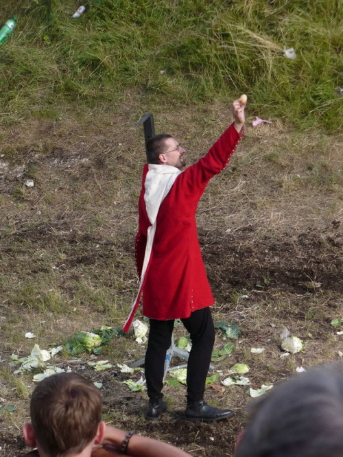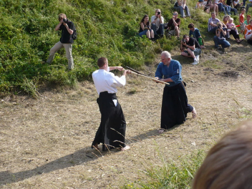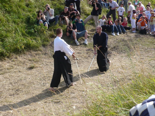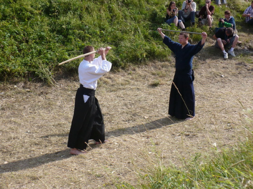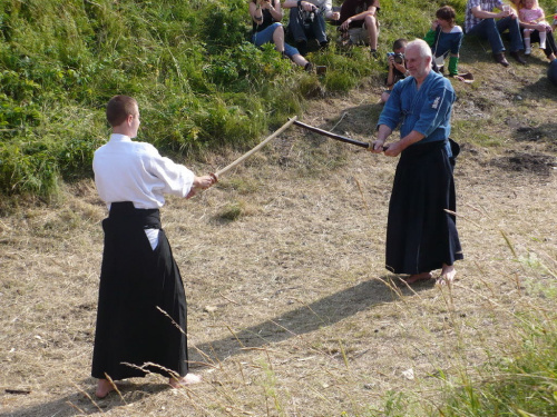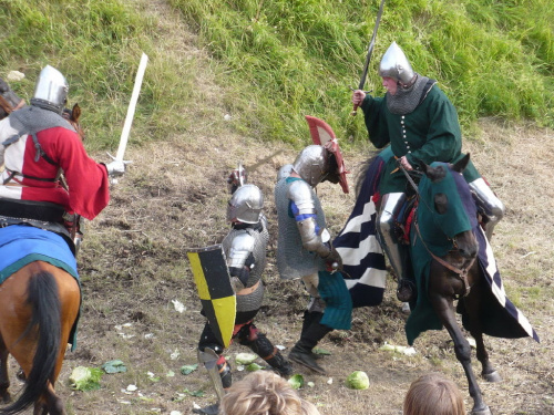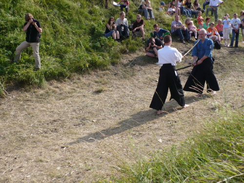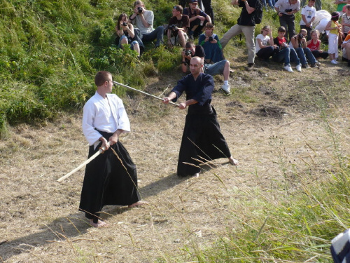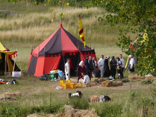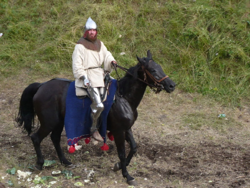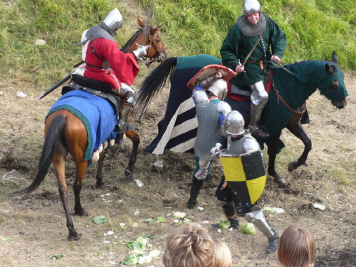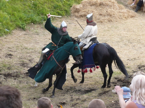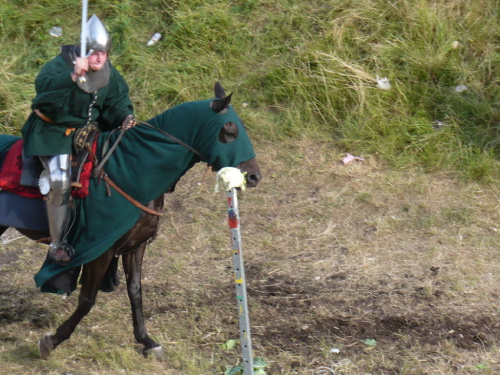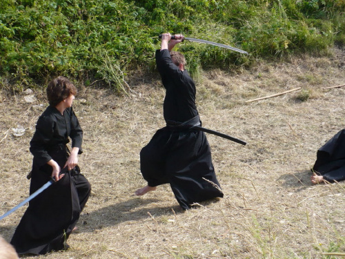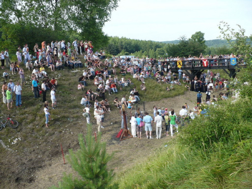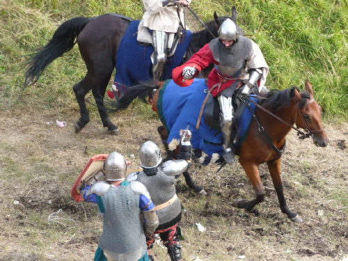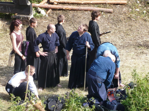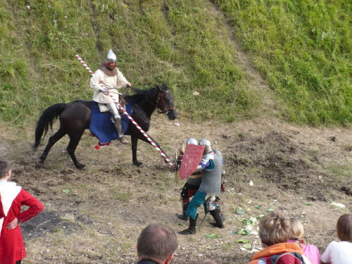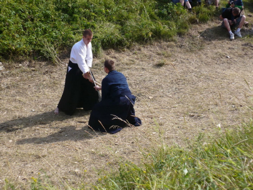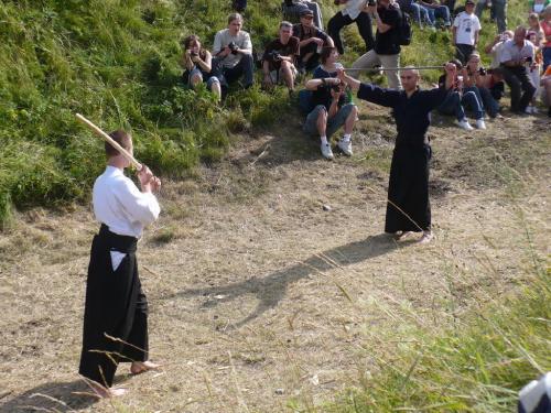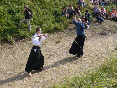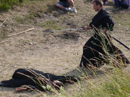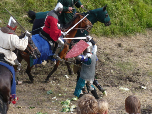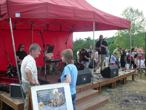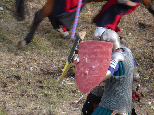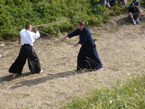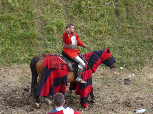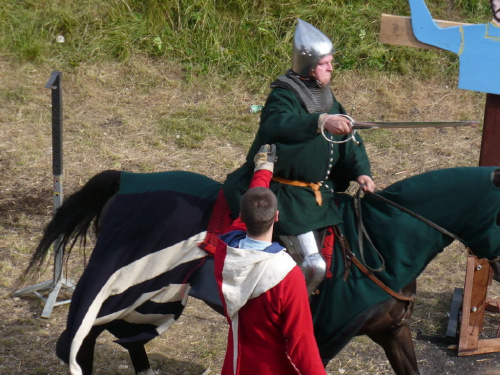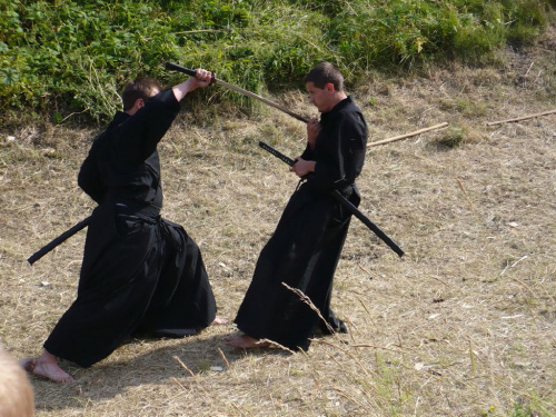 Na turniej udało mi się dotrzeć w niedzielę, na dwa ostatnie punkty programu. Był to pokaz Kendo i Iaido oraz pokazy konne rycerzy. Później był jeszcze koncert folkowego zespołu Banshee (folk irlandzki), ale niestety nie mogłem zostać. Arena zmagań turniejowych umiejscowiona była w fosie. Ludzie siedzieli na zboczach jak w amfiteatrze, stali też na moście. Pokaz Iaido i Kendo był prezentowany przez członków szkół z Olkusza i Krakowa. Brali w nim udział, między innymi: mistrzowie polski i mistrz europy, co gwarantowało bardzo wysoki poziom. Pokazywano jak wyglądały ćwiczenia, i inscenizowano scenki. W przypadku Iaido były to niespodziewane ataki na siedzącego samuraja. Był też pokaz walki kijem przeciwko samurajowi uzbrojonemu w miecz. Na koniec był pokaz walk Kendo według zasad obecnie stosowanych na światowych turniejach. Później chwila przerwy i w fosie pojawiło się czterech rycerzy na koniach. Pokazy zręczności zaczęli od zbierania mieczem pierścieni trzymanych przez giermka. Było ścinanie głów kapusty i jajek. Później była demonstracja walki piechurów z konnymi, a właściwie pokaz miażdżącej przewagi rycerza konnego nad pieszym. Jak wyjaśniał komentator, była to walka rycerzy z piechurami, bo bez konia to właściwie już nie rycerze. Na koniec po ogłoszeniu wyników turnieju doszło do sprzeczki i w konsekwencji walki na koniach między dwoma rycerzami. Po krótkiej potyczce rycerze odjechali do obozu, który znajdował się nieopodal na łące. Całość była świetnie prowadzona przez spikera. Z humorem, ale i wieloma ciekawymi komentarzami. Mimo, że widziałem tylko dwa pokazy, widać było, że turniej jest całkiem okazały. Naprawdę dużo ludzi. Poza pokazami można było nabyć różne pamiątki na straganach pod zamkiem. Był również stragan gdzie można był kupić cegiełki na ratowanie zamku i różne materiały o jego historii. A dla głodnych czy spragnionych ogródek z kiełbaskami i piwem. Jedynym powodem do narzekania było to, że nie dało się wejść na sam zamek, który jest zamknięty z powodu prac remontowych. Zdecydowanie warto się wybrać do Rabsztyna, i zdecydowanie na dłużej niż ja.