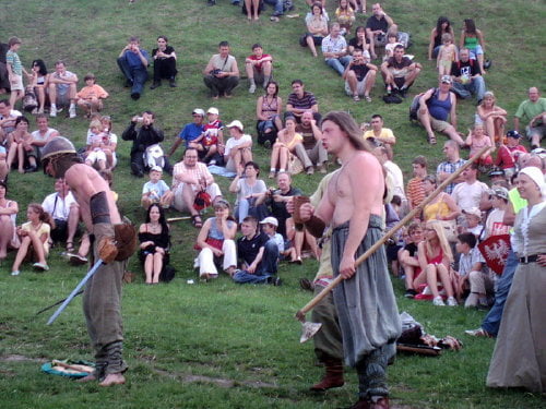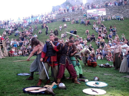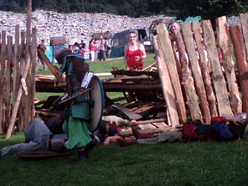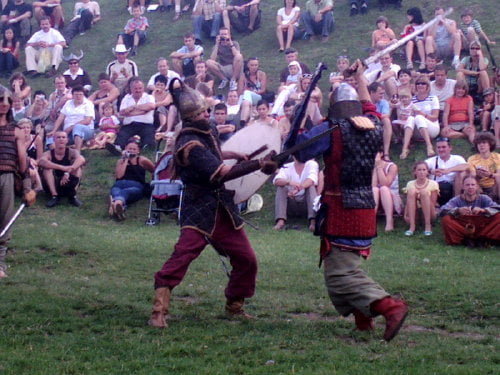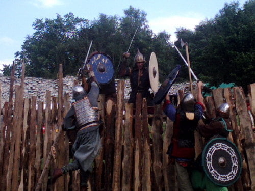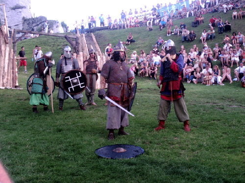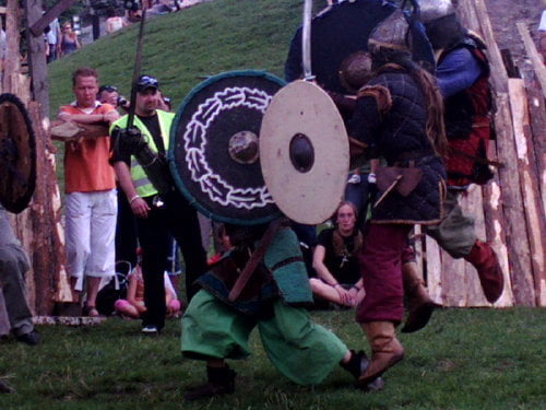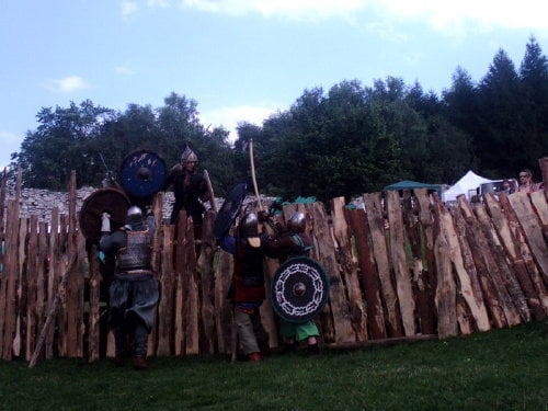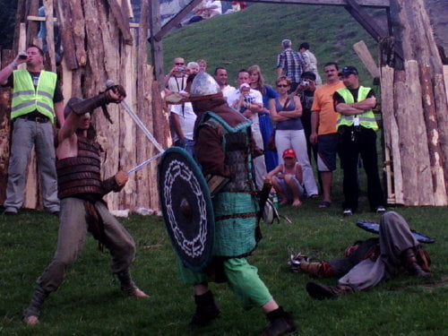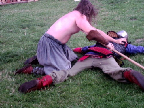 Na turniej, a właściwie jego zakończenie, dotarłem w niedzielę. Dwa ostatnie punkty programu to pokazy: różnych zabaw i gier wojów oraz pokaz rycerzy konnych. Wojowie prezentowali rozrywki którym się oddawali we wczesnym średniowieczu. Przeważnie zaczynało się od ustawienia się w kręgu. Później jakiś woj wychodził na środek i wyzywał innego na pojedynek, albo tworzyli pary, a zwycięzcy walczyli między sobą (taki system pucharowy). W najbrutalniejszej wersji wszyscy walczyli ze wszystkimi bez jakichkolwiek zasad (kilku na jednego, ataki od tyłu…). Była krótka inscenizacja ataku dwóch berseraków na trzech wojów, oraz nieoczekiwanie zakończona scenka obrony grodu przed najeźdźcami. Płot który imitował palisadę zawalił się pod naporem… obrońców, o mało nie zgniatając najeźdźców. Były pokazy walk w szykach bojowych. Generalnie wojowie dali efektowny i ciekawy pokaz.