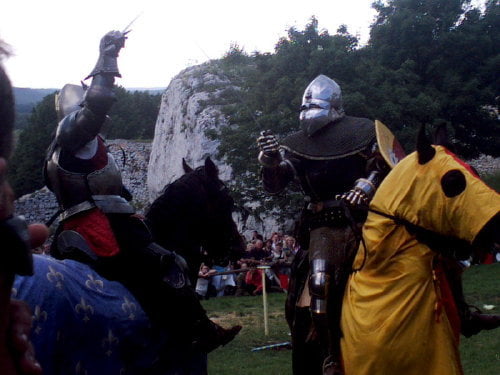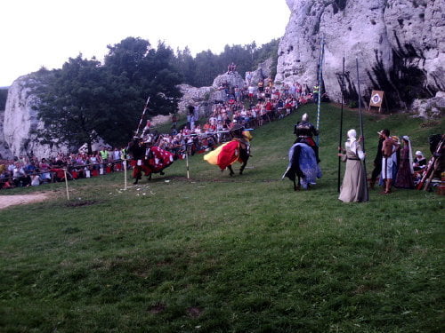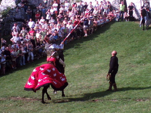 Na koniec trzech konnych rycerzy demonstrowało turniejowe konkurencje: zbieranie pierścieni kopiami (w różnych konfiguracjach w tym w locie), trafianie kopią w tarczki różnej wielkości, ścinanie kapusty, atak na „saracena”. Był też mały pokaz pojedynku na kopie i walki na miecze. Rycerze popisali się dużymi umiejętnościami.