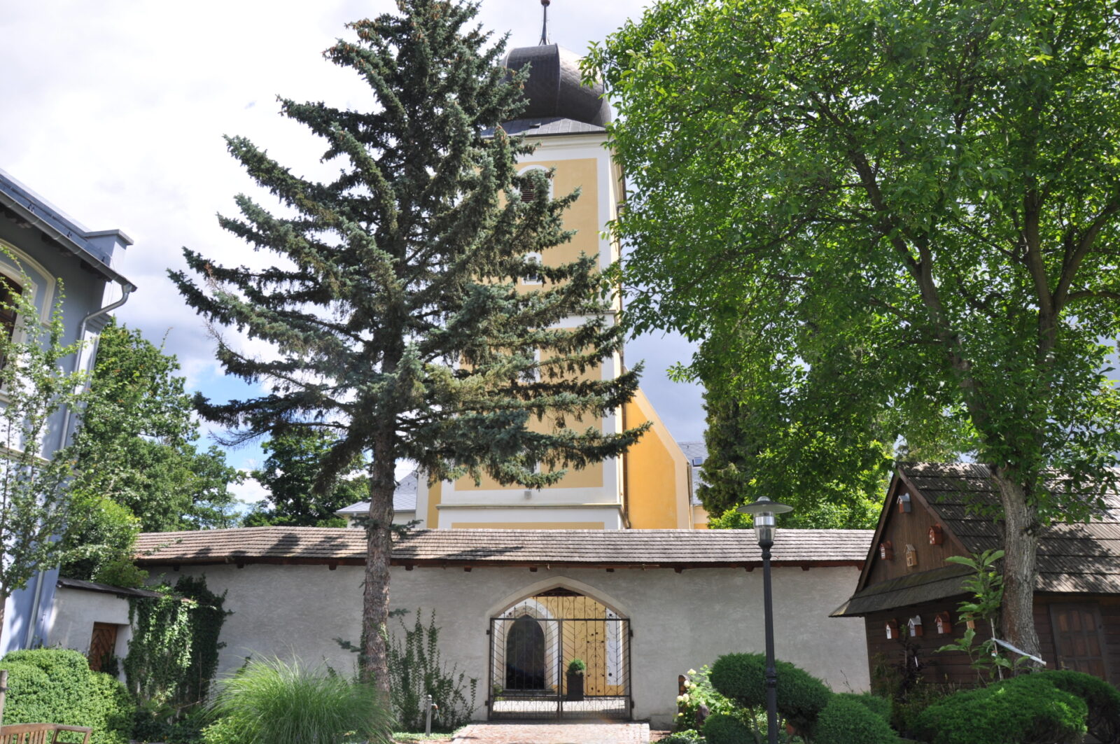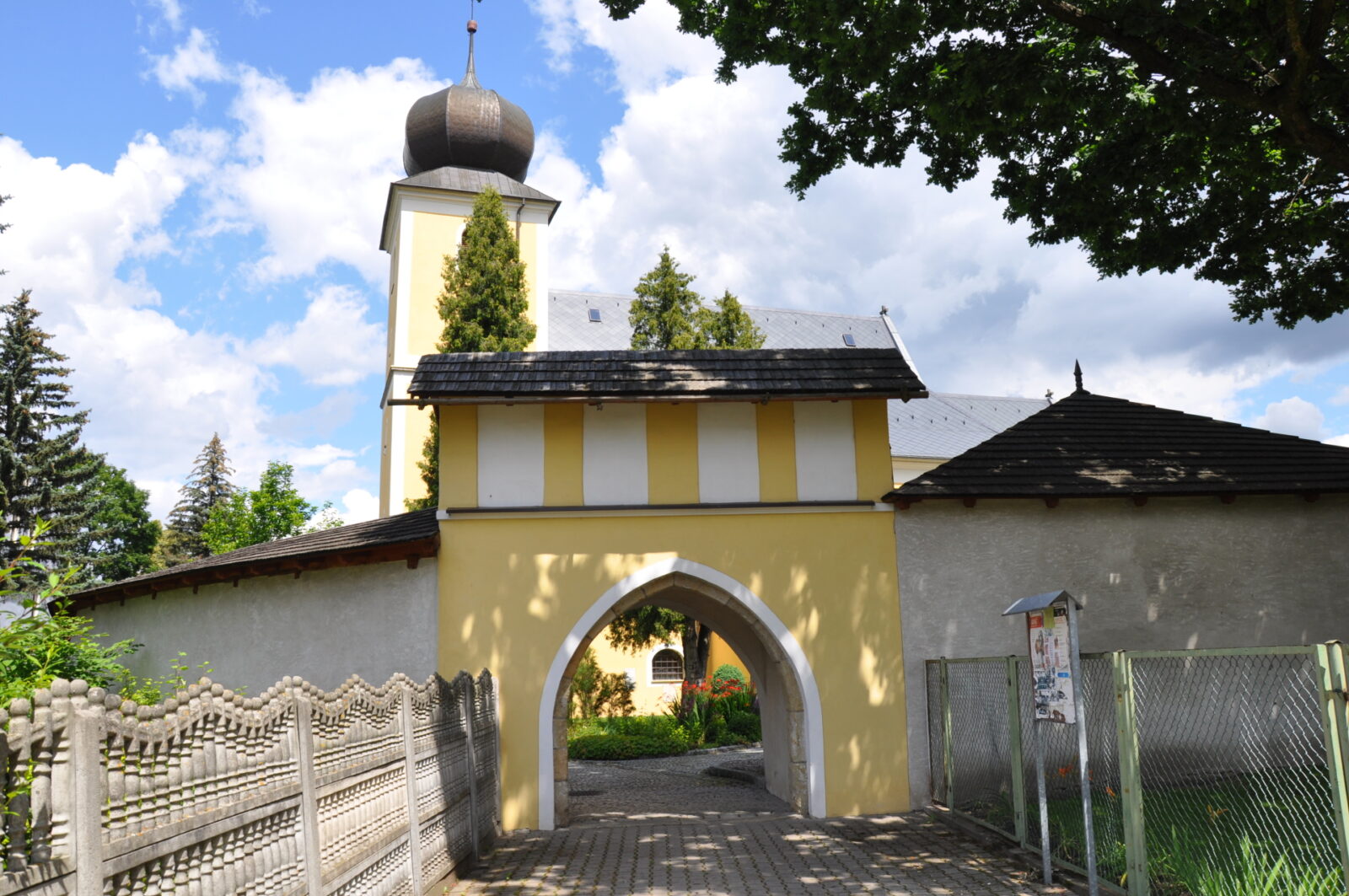 Pierwotny, gotycki kościół pw Św. Jakuba wzniesiono w 1326 roku, przebudowano gruntownie w okresie baroku. Kościół jest otoczony murem w którym widoczne są ślady otworów strzelniczych. Formę gotycka zachował również budynek bramny z barokową figurą św. Jana Nepomucena w attyce. Mur kościelny powstał prawdopodobnie w tym samym okresie co sam kościół, czyli w XIV wieku.