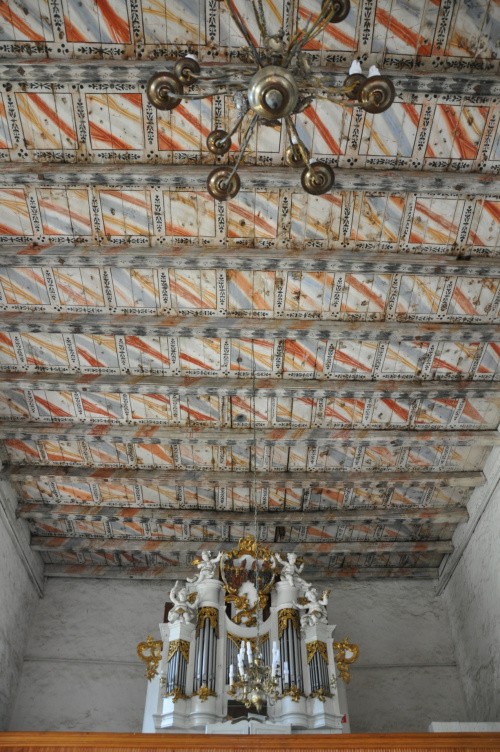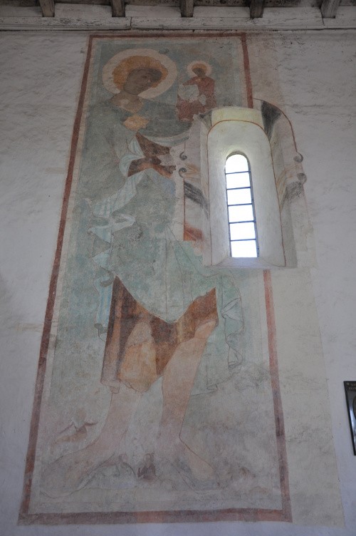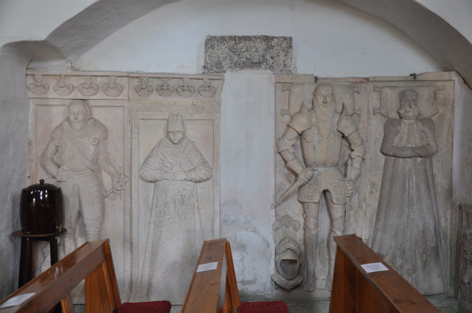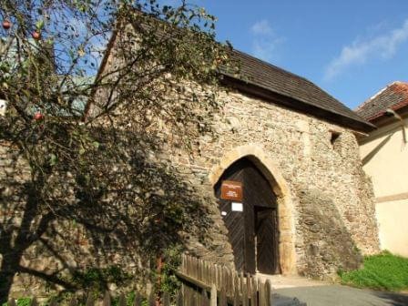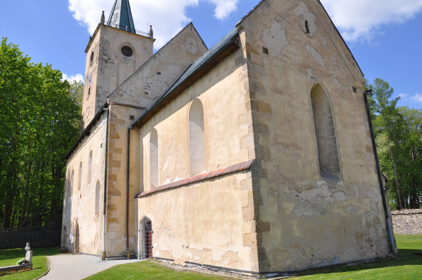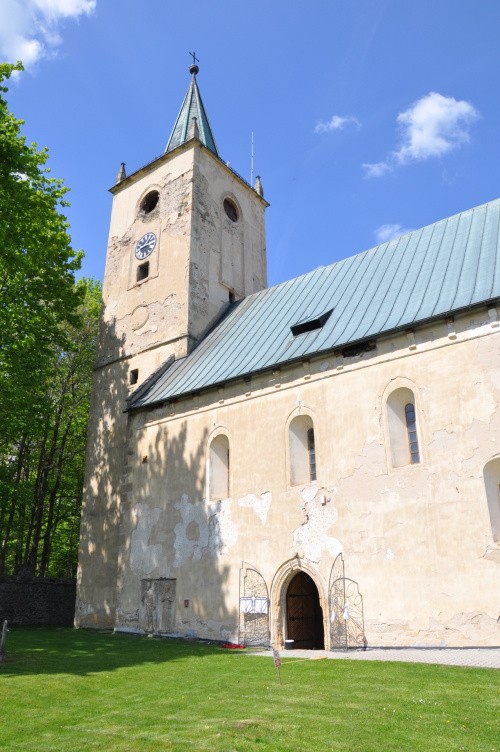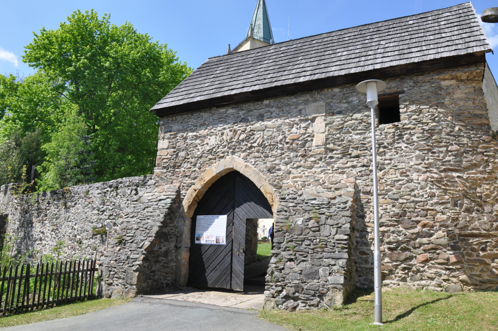 XIII wieczny kościół bez cech obronnych otoczony w XV wieku fortyfikacjami - murem z blankami i bramą. (fot. październik 2014)