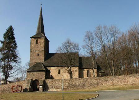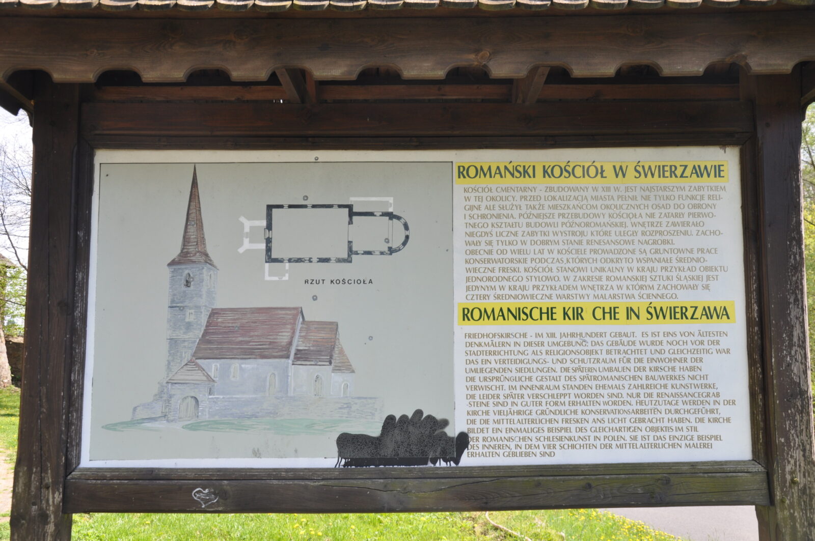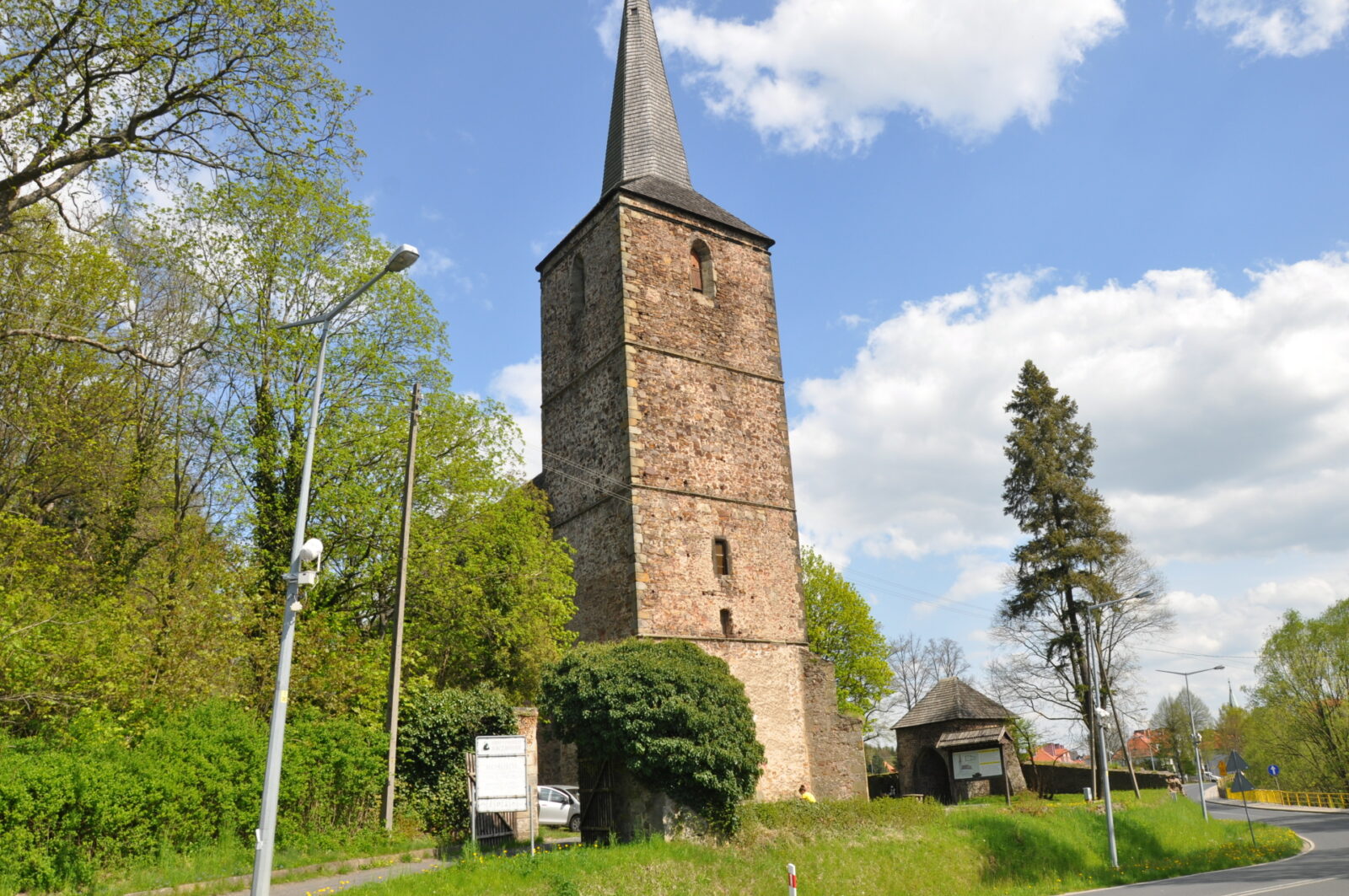Dawny parafialny kościół św. Jana Chrzciciela i św. Katarzyny Aleksandryjskiej był inkastelowany, o czym świadczy otaczający go XV-wieczny mur solidną oskarpowaną bramą. Powstał w II połowie XIII wieku i do dziś przetrwał w prawie niezmienionym wyglądzie. Wyznacznikiem kościoła jest czworoboczna wieża dobudowana do bryły głównej kościoła w 1506 roku. Kościół jest murowany z kamienia, jednonawowy, z prezbiterium zamkniętym półkolistą apsydą. Nawa i prezbiterium przykryte stropem drewnianym wspartym na dwóch słupach. W apsydzie trzy romańskie okna z kolumienkami. Od strony zachodniej i południowej dwa portale o cechach gotyckich. Prawdziwym dziełem kunsztu kamieniarskiego jest wspaniały portal z Drzewem Życia, pochodzący z XII wieku. Jednak największą atrakcją zabytku są malowidła, które zdobią ściany świątyni. Odkryte w 1977 roku pod warstwami tynku ścienne malowidła o tematyce zwierzęcej i roślinnej pochodzą z XIII wieku. Przedstawiają dosyć nietypowe zwierzęta takie jak bocian, żyrafa czy ryby. Malowidła te są ściśle związane z symboliką życia. Ścianę północną kościoła zdobią XIV-wieczne malowidła ukazujące życie Katarzyny Aleksandryjskiej wg "Złotej Legendy". Jest to najszersze ze znanych przedstawień obrazowych życia tej średniowiecznej świętej w Europie środkowej. Posiada dwuspadowe dachy nawy i prezbiterium oraz hełm wieży kryte gontem. Wnętrze oświetlają rozglifione okna w kamiennych opaskach, przeważnie zamknięte półkoliście. Z czasów, gdy kościół służył ewangelikom zachowały się: drewniana, polichromowana ambona z 1613 r., renesansowe, drewniane stalle z 1562 r. oraz zespół 12 XVI w. kamiennych płyt nagrobnych i epitafiów przedstawicieli rodów v. Hoberg (późniejszy Hochbergowie z Roztoki i Książa), v. Zedlitz i v. Nimptsch. Obiekt znajduje się na północnych przedmieściach miasteczka w pobliżu mostu na Kaczawie, przy drodze do Złotoryi. Kościół jest udostępniony do zwiedzania od piątku do niedzieli, jednak najlepiej wcześniej umówić się telefonicznie.