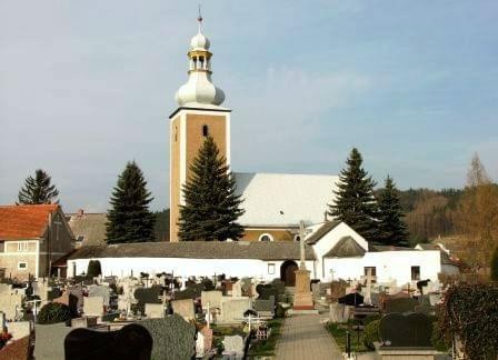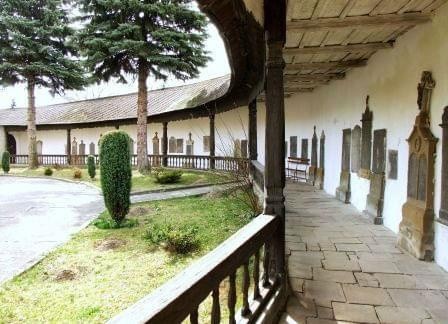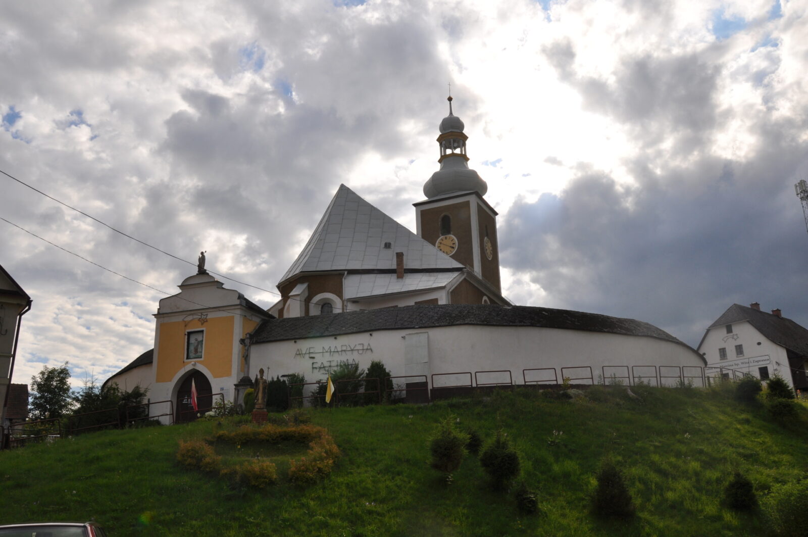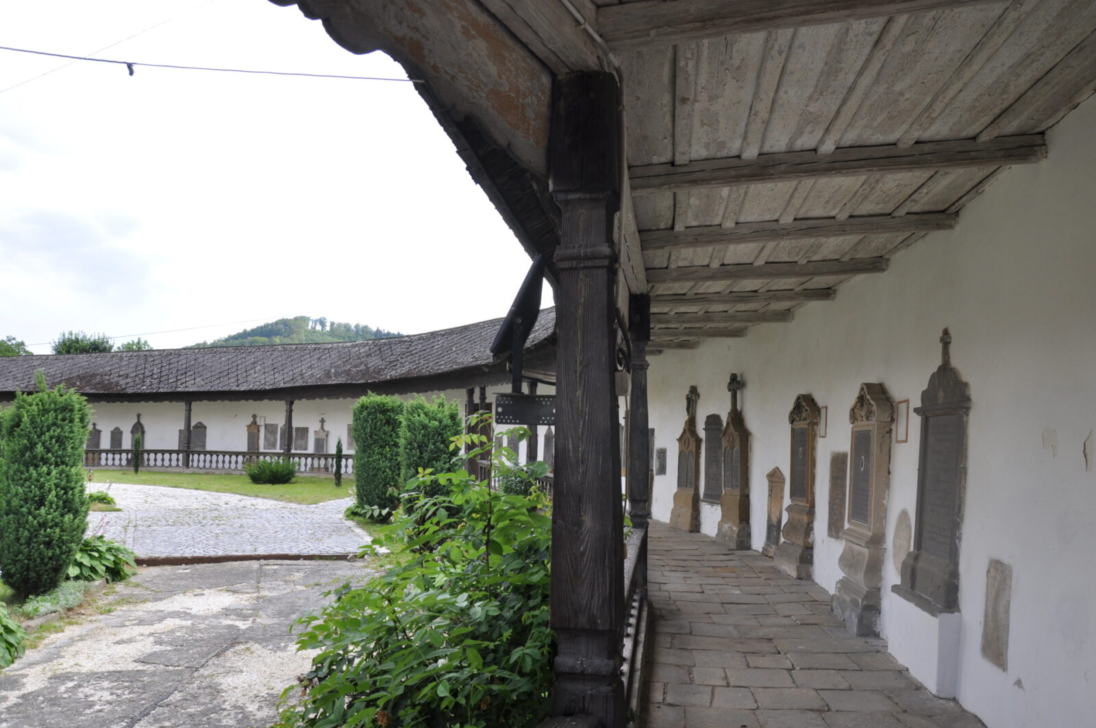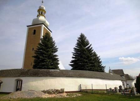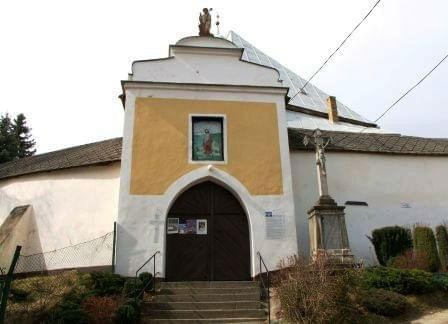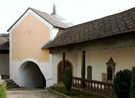 Kościół zbudowany w XIV wieku znajduje się na wzniesieniu, które otacza mur obronny z XIV lub XV wieku. Podczas jego przebudowy w 2 połowie XVII wieku. umieszczono w nim nowe bramy i kaplice. Główna brama - piętrowa (niegdyś wieżowa) ma ostrołukowy prześwit. Od wewnątrz wzdłuż muru biegnie krużganek wsparty na drewnianych, profilowanych słupkach, połączonych na dole drewnianą balustradą. W murze zachowane szczelinowe okienka – obecnie pod tynkiem. (fot. marzec 2014)