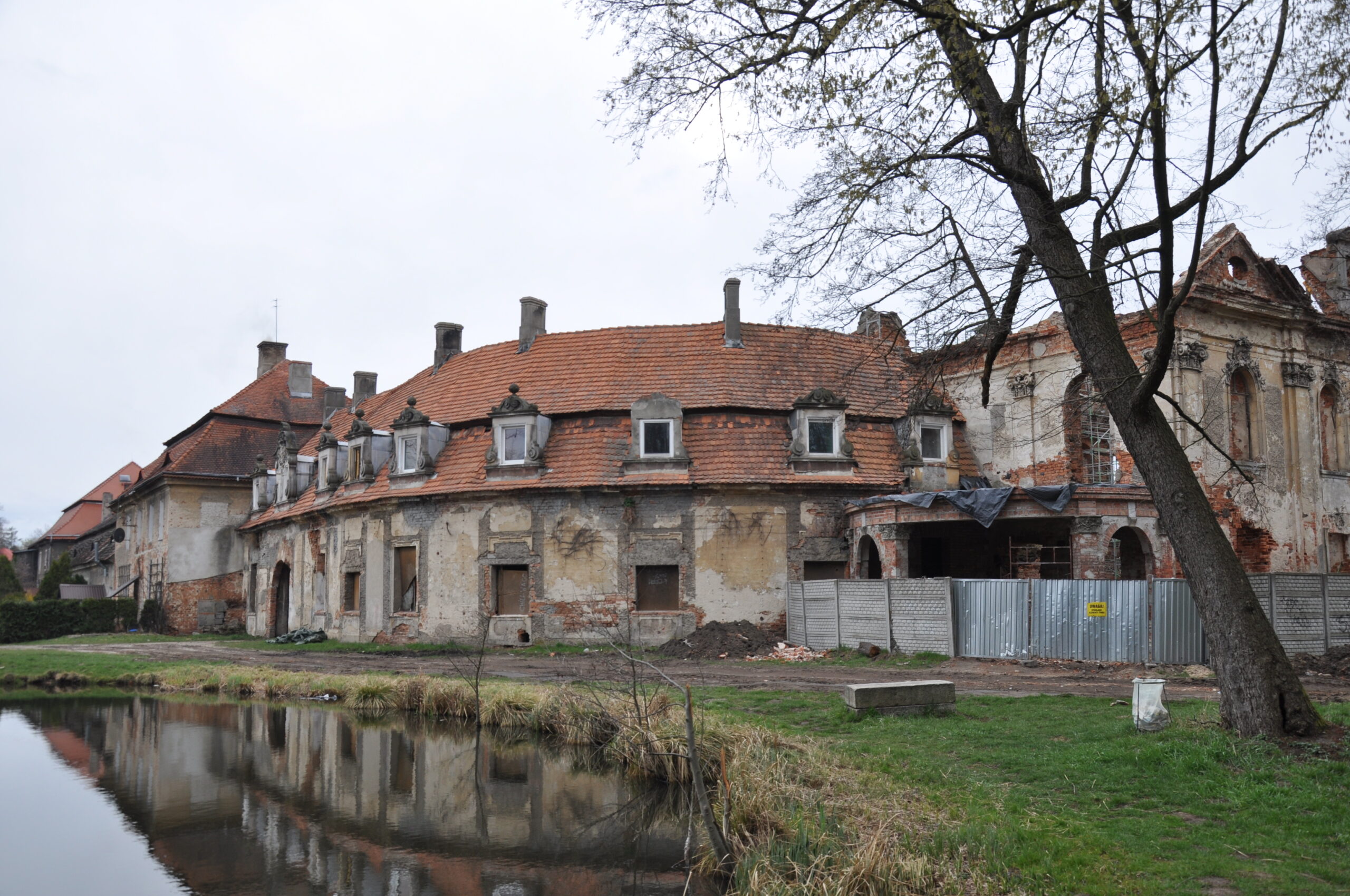 Informacje na temat tego obiektu nie sa moim zdaniem do końca potwierdzone. W miejscu, w którym dzisiaj stoją ruiny pałacu już w XII w. istniał zamek (wydaje mi się, że prędzej mógł to być gródek obronny), a okoliczne dobra, do XVI w. należały do biskupstwa wrocławskiego. Wspomina o tym bulla papieża Adriana VI już w 1156 r. Kolejnymi właścicielami była rodzina von Dohn, która prawdopodobnie na miejscu zamku postawiła dwór. W 1727 roku cały majątek zakupiła rodzina von Reichenbach, która na miejscu na miejscu dworu wybudowała w latach 1730 - 1740 pałac. Nie posiadam informacji czy może nowi właściciele przebudowali dwór w istniejący pałac czy wybudowali pałac od podstaw. W tym wypadku brak informacji co sie stało z dworem, być może mógł zostać zniszczony podczas potopu. Jak na razie zbyt wiele niejasności. Obecnie obiekt jest w stanie zaawansowanej ruiny.