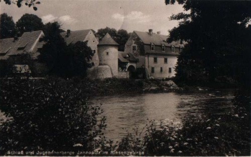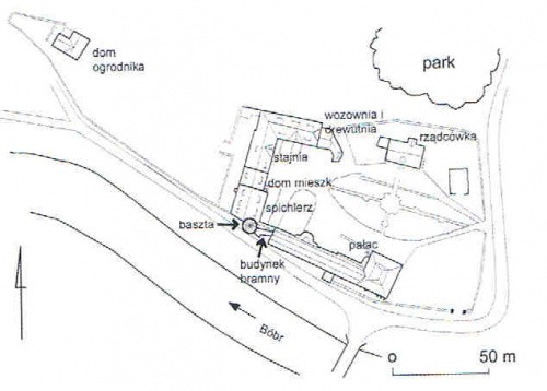 W latach 1608-09 wzniesiono nad rzeką Bóbr rezydencję, dla Daniela Schaffgotscha (według tradycji – na miejscu starszego zamku, jednak ani zachowane detale architektoniczne, ani dokumenty tego nie potwierdzają). Został on spalony przez Szwedów w 1642 r. i w 2 poł. stulecia odbudowany przez wdowę po Danielu – Jadwigę. Gruntowna przebudowa miała miejsce w 1775 r., następne w latach 1830-1840 (wówczas dla Wilhelma Stolberga) założono piękny, dobrze zachowany do dziś park krajobrazowy z widokiem na Janowice, Rudawy Janowickie i pobliskie Góry Sokole. Do dziś w parku zachowało się blisko siedemset drzew. W 1910 r. powstały stylowe, drewniane, przysłupowo-ryglowe budynki gospodarcze. Z renesansowego detalu zachował się kominek w dawnej sali balowej. Dziś dwór funkcjonuje jako Dom Pomocy Społecznej i należy do jednych z najlepiej utrzymanych obiektów z tego okresu. Baszta, która może imitować obronność założenia została wzniesiona w 1910 roku wraz z innymi budynkami gospodarczymi imitującymi zabudowania zamkowe.