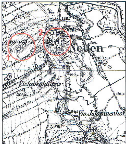 wycinek mapy topograficznej: 1-wzgórze Stróżnik, 2-dawny folwark w Nowej