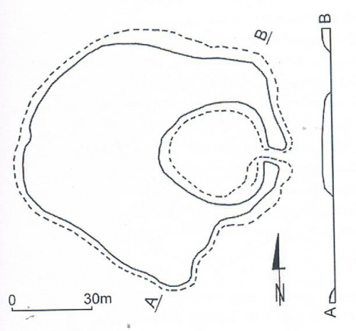 Przed 1945 rokiem obiekt miał formę owalnego kopca o średnicy 32m i wysokości ok. 1 m. Nasyp otaczała częściowo zamulona fosa o szerokości 5-8m. Średnica całego założenia wraz z fosą wynosiła ok. 45m
