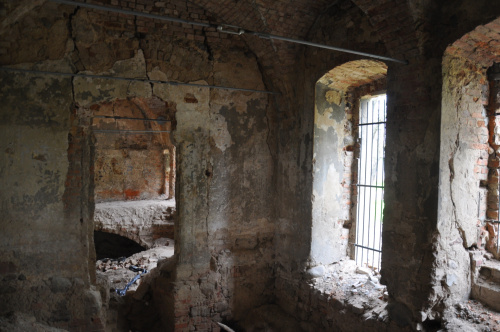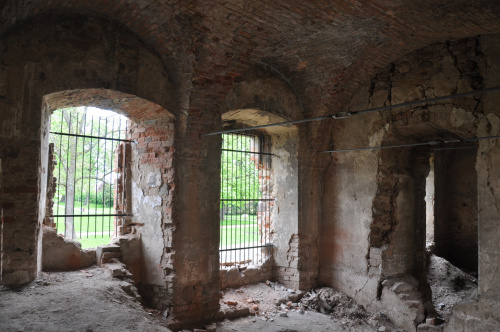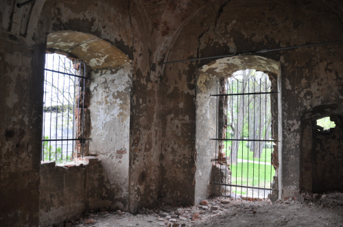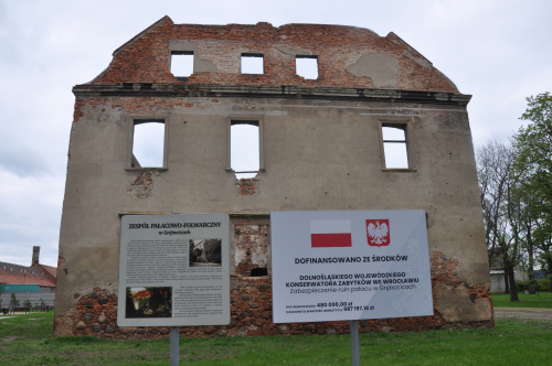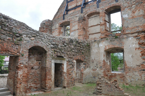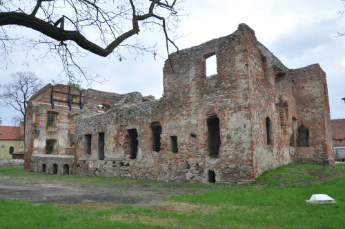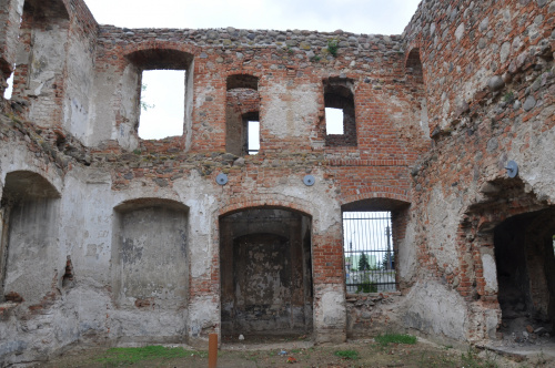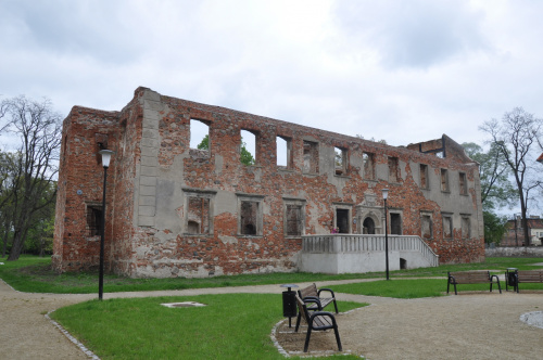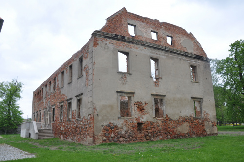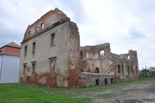 Dwór był przeznaczony do rozbiórki już w latach 80-tych, na szczęście właścicielowi (gminie) zabrakło środków. Wciąż okazałe ruiny znajdują się naprzeciw kościoła. Od ulicy część barokowa, w jednej linii ze spichrzem, głębiej od strony folwarku, renesansowa, w lepszym stanie. Zachowane liczne sklepienia i opisany tu portal. Kilka komnat przyziemia pokrytych polichromią: niezbyt czytelna szwabacha, pod nią barokowe malarstwo iluzjonistyczne przedstawiające okna z pejzażami, pod barokiem czerwona i niebieska renesansowa groteska.