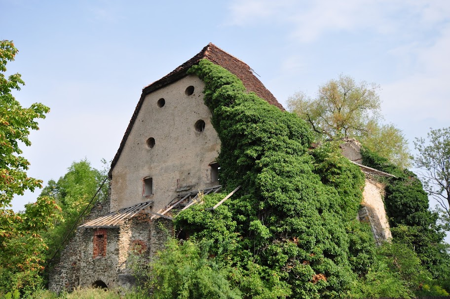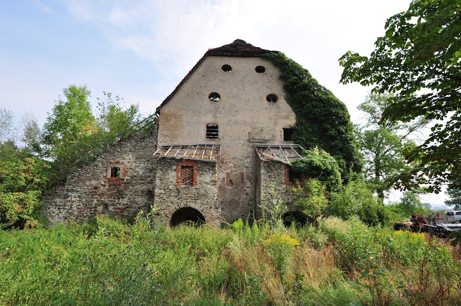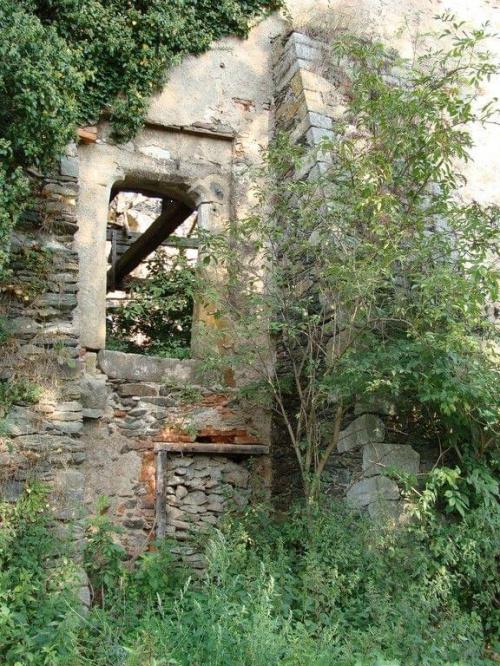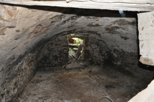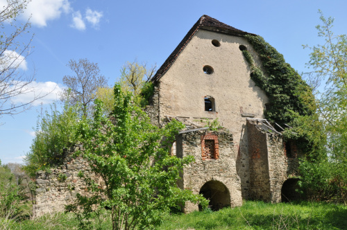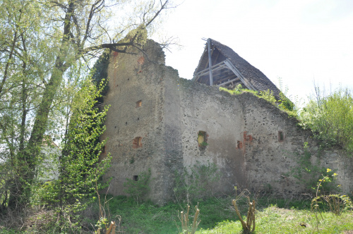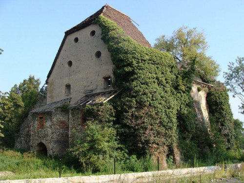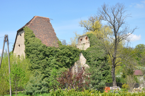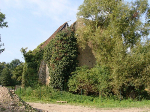 opuszczony dwór nazywany spichlerzem stoi około 250 metrów od kościoła. Został wybudowany pomiędzy latami 1500 a 1525. jest to obiekt wzmocniony przyporami z alkierzami po stronie zachodniej. Od strony północnej znajduje się przybudówka, która w rzeczywistości jest reliktem najstarszej części założenia, najprawdopodobniej XV -wiecznej wieży mieszkalnej do której dostawiono w XVI wieku budynek. reliktem tej budowli jest aneks stykający się z głównym korpusem od strony północno-zachodniej. Mury w przyziemu maja grubość ok. 1,3m. Został on wzniesiony na planie prostokąta o wymiarach 10,2x8,3m i przetrwał do wysokości II piętra, które podczas przebudowy dworu na spichlerz zostało przycięte. Dwór był wieżą mieszkalną, sklepiona kondygnacja przyziemia pełniła funkcję mieszkalną. przypuszczalne datowanie określa się na XV wiek. Pomiędzy XVI, a XVII wiekiem do wieży dobudowano trójkondygnacyjny budynek dworu na planie prostokąta.