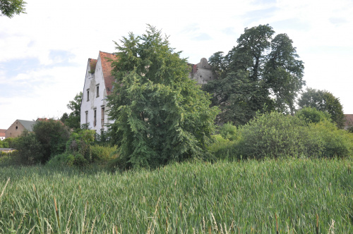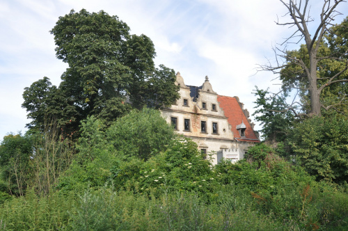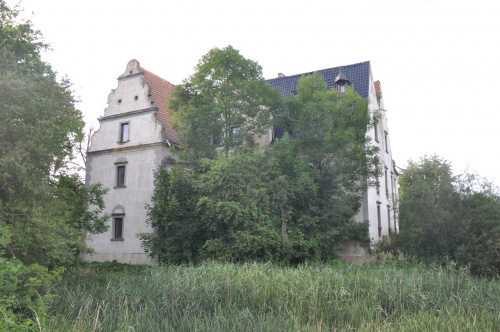 Pierwotny dwór na wyspie, otoczony fosą został wzniesiony około 1521 roku. Przebudowany został około 1607 roku, następnie około 1700 roku i w XIX wieku. Częściowo uszkodzony w 1945 roku. Jest to założenie prostokątne, trzytraktowe, trzykondygnacjowe, z bogatymi szczytami sterczynowymi i fragmentami dekoracji sgraffitowej na elewacjach. We wnętrzach zwracają uwagę drewniane stropy z profilowanymi belkami, a w jednej z sal kominek z końca XVII w., ozdobiony kafelkami z Delf.