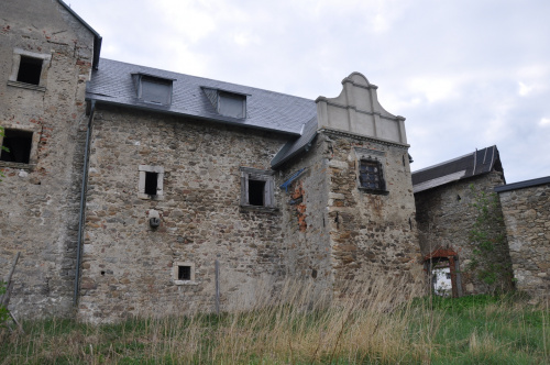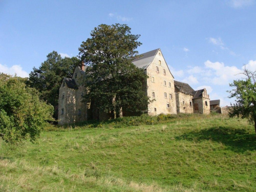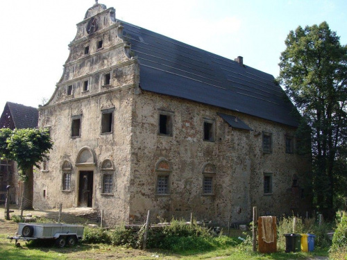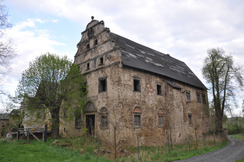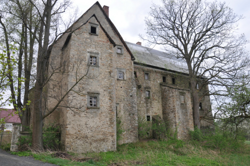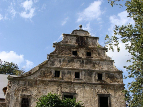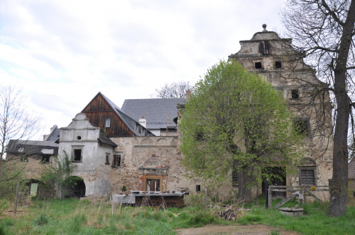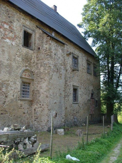 Dwór, wzniesiony z kamienia, cegły i z wykorzystaniem konstrukcji ryglowej, uzyskał wczesnorenesansowe formy i – pierwotnie – nietypowy kształt dwuskrzydłowego założenia z ciasnym dziedzińcem, zamkniętego murem kurtynowym zwieńczonym attyką. W tym murze od płd. umieszczono, ujęte portalem, główne wejście. Takie rozplanowanie wynikało zapewne nie z przyjętej koncepcji („w modzie” były wówczas założenia trójskrzydłowe), ale z faktu wykorzystania starszej budowli – dobudowano tylko do niej nową część, przebudowano wnętrza i elewacje. Dwa wzniesione wówczas skrzydła, to północna (starsza) i zachodnia część dworu. Niejednoczesnego powstania poszczególnych skrzydeł dowodzą różne rodzaje stosowanych murów, różne wysokości kondygnacji, a przede wszystkim jeden detal – okienko piwniczne we wschodniej ścianie skrzydła północnego, które po dobudowaniu trzeciego, wschodniego skrzydła, znalazło się wewnątrz budynku. Zastosowana kamieniarka (m.in. główny portal i obramienia okienne na fasadzie, ozdobione motywem rozet) wskazują na włoskie pochodzenie kamieniarzy. Dwór po przebudowie, pomimo tradycyjnego, zamkniętego („zamkowego”) układu i położenia nad stromą skarpą (odziedziczonego po starszym zamku) nie był już założeniem obronnym.