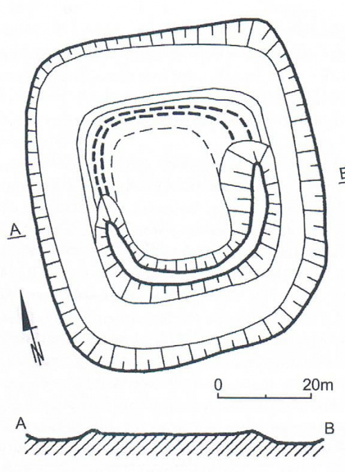 resztki muru kamiennego na wale oraz śladowe ilości cegieł na majdanie