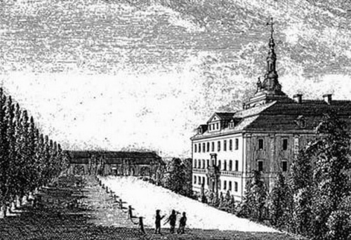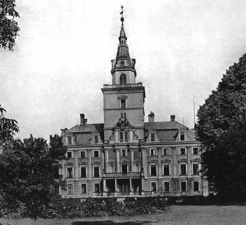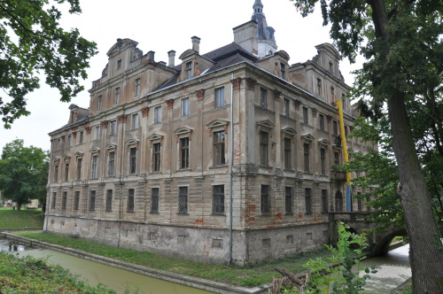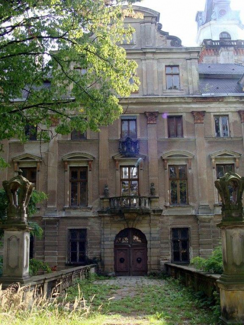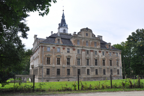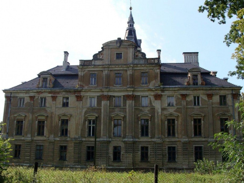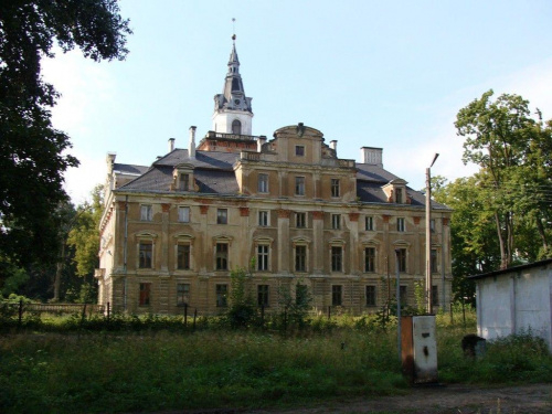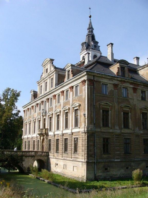 Renesansowy dwór obronny zwany też starym zamkiem wodnym powstał w XVI wieku z fundacji Hochbergów. Z dworu i otaczających budowli stworzono jednolitą bryłę z obszernym wewnętrznym dziedzińcem, do której wiodły dwa mosty. W 1720 roku został przebudowany na rezydencję barokową, później przebudowany w XIX w. Pałac, otoczony fosą, wyróżnia się 6-piętrową wieżą, barokowym portalem wejściowym. Obecnie znajduje się w stanie ruiny mimo restauracji w 1953 roku.