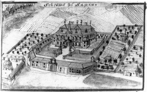 dwór na XVIII-wiecznej rycinie Wernera