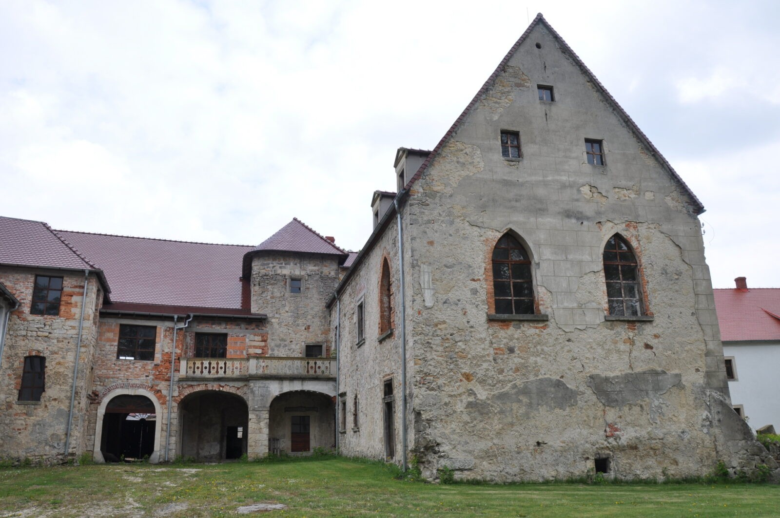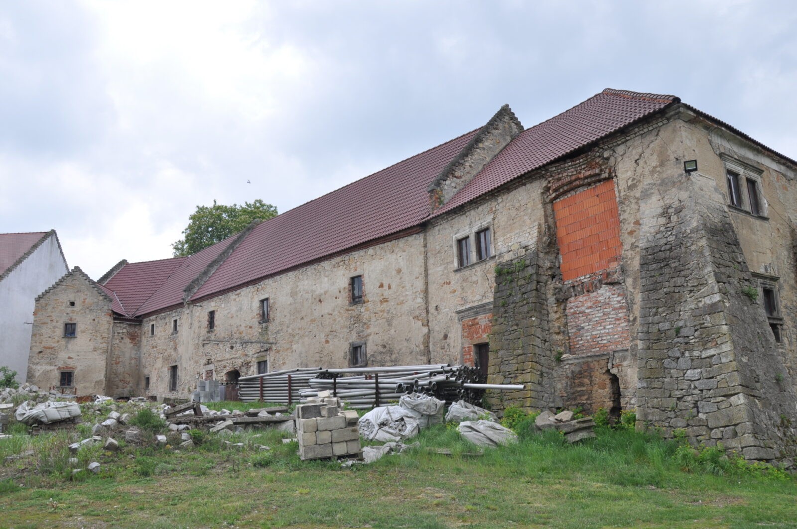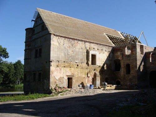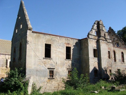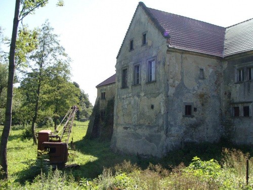 We wsi, na wschód od ruin zamku znajduje się dwór pierwotnie renesansowy wybudowany w 1540 roku. Rozbudowywany z przerwami do 1612 r. (data na sygnaturce), restaurowany w XVIII i XIX w., stanowi budowlę dwukondygnacjową, założoną na rzucie podkowy o nieregularnych fasadach z ozdobnymi szczytami i dekoracją sgraffitową, z ryzalitami i wykuszami na narożnikach. Ostatnia restauracja z 1899 r. zniszczyła niestety szereg autentycznych detali. Całość otoczona jest fosą z wodą, przez którą prowadzi kamienny most z XVIII w.