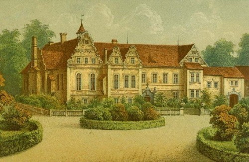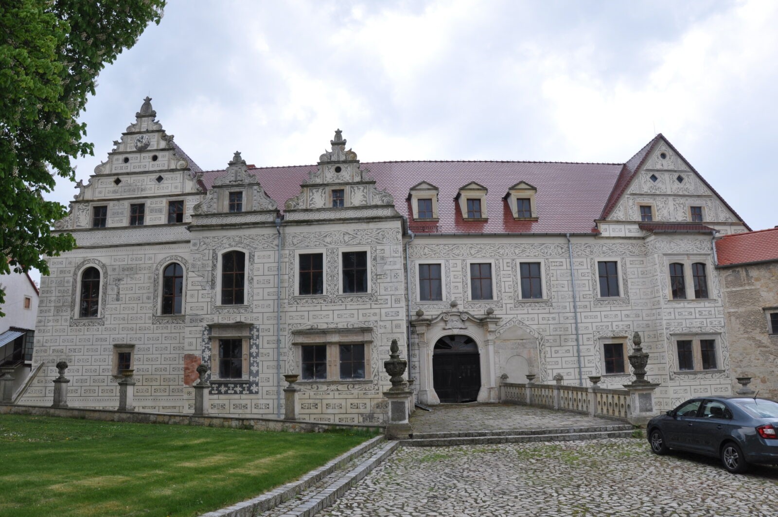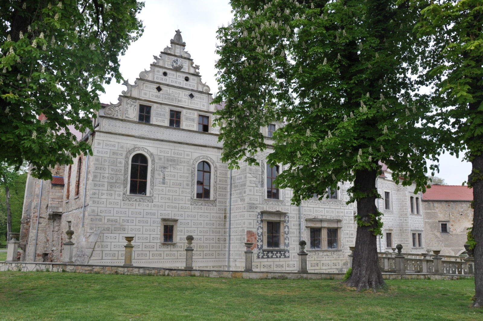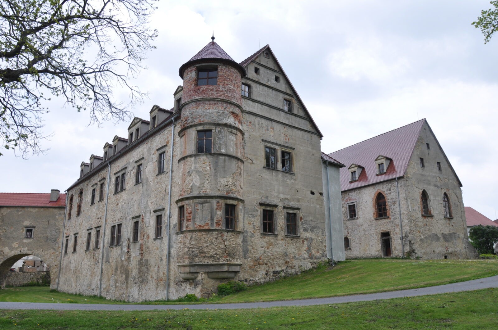 We wsi, na wschód od ruin zamku znajduje się dwór pierwotnie renesansowy wybudowany w 1540 roku. Rozbudowywany z przerwami do 1612 r. (data na sygnaturce), restaurowany w XVIII i XIX w., stanowi budowlę dwukondygnacjową, założoną na rzucie podkowy o nieregularnych fasadach z ozdobnymi szczytami i dekoracją sgraffitową, z ryzalitami i wykuszami na narożnikach. Ostatnia restauracja z 1899 r. zniszczyła niestety szereg autentycznych detali. Całość otoczona jest fosą z wodą, przez którą prowadzi kamienny most z XVIII w.