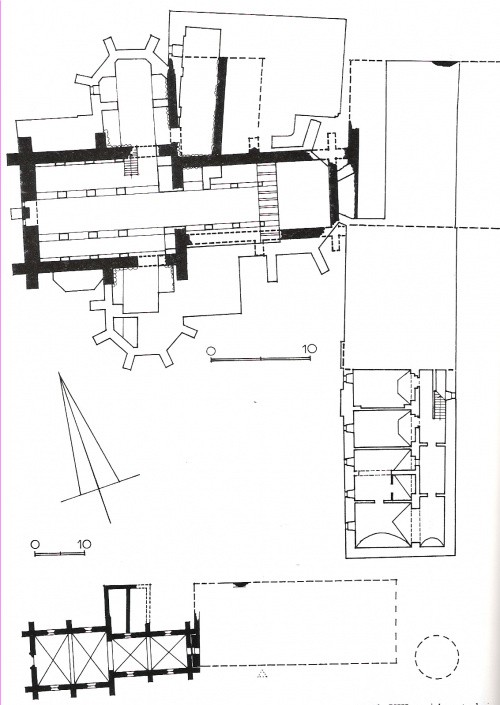 kościół św. Macieja, plan piwnic z oznaczeniem murów z I połowy XIII wieku i konstrukcja pierwotnego planu z prawdopodobnym zarysem dworu wg. E.Małachowicza