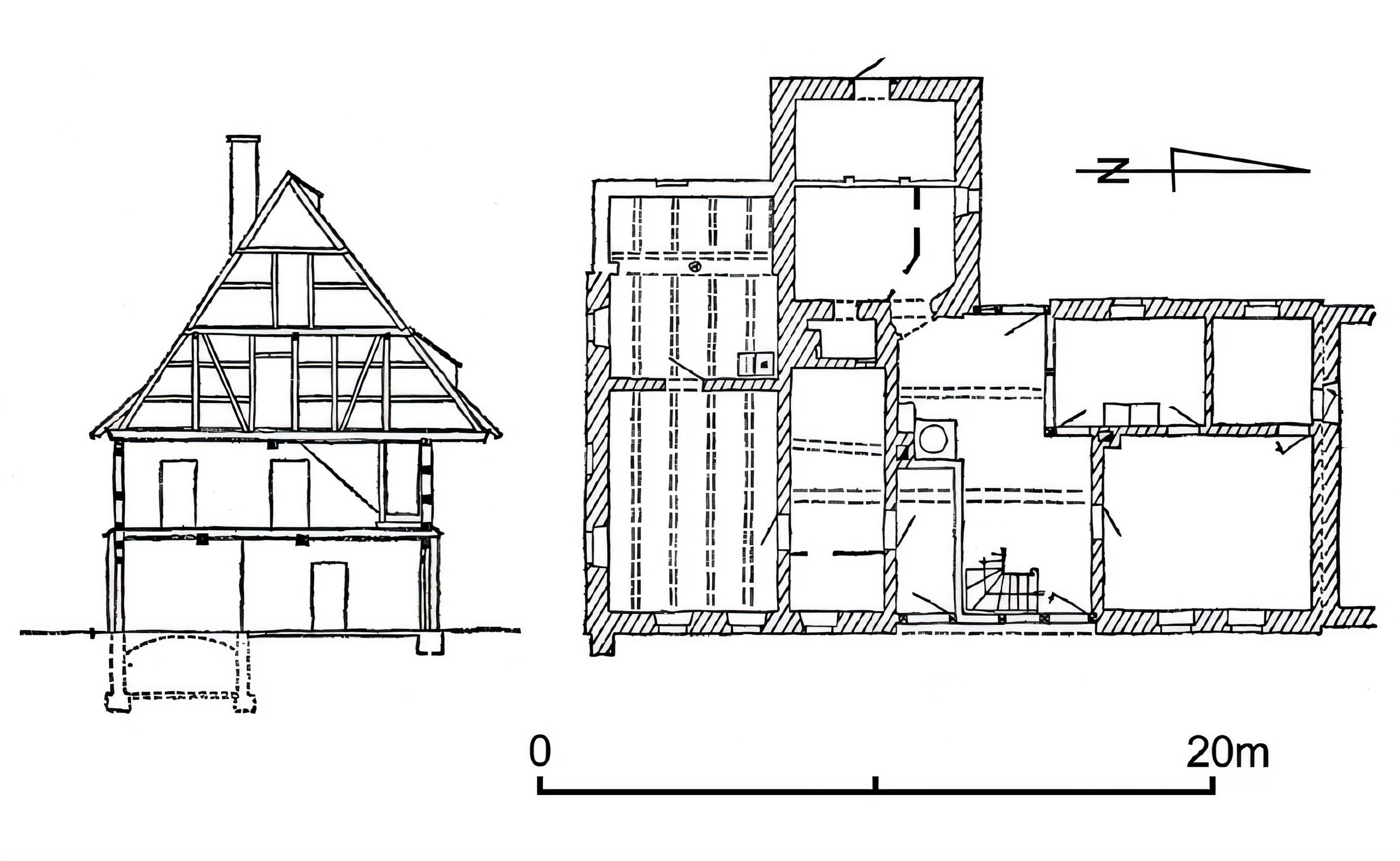 WROCŁAW-OPORÓW, plan i przekrój dworu (za Degen 1965, s. 205, ryc. 84, 85)