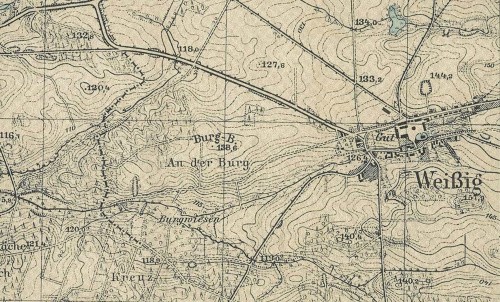 Lokalizacja przybliżona, na W od wsi w kierunku stacji kolejowej w Rudnej zapewne w okolicach wzniesienia 138,6 zw. Burgberg an der Burg oraz łąki zw. Burgwiesen.