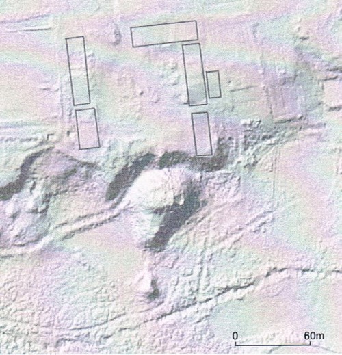 Obiekt położony na krawędzi wysokiej skarpy przylegającej do podmokłej doliny niewielkiego cieku na S od wsi i zabudowań dawnego folwarku.