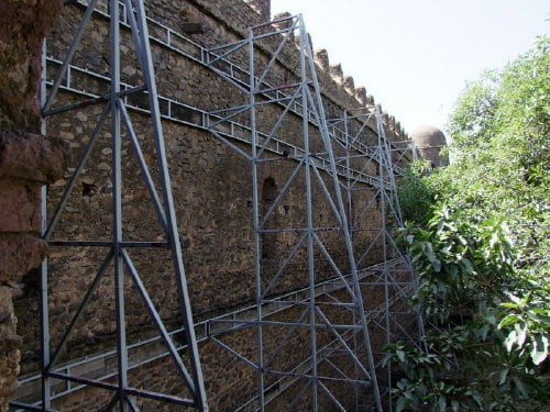 Jest prawie pewne, że w pracach budowlanych (zwłaszcza przy pierwszym zamku) uczestniczyli hinduscy budowniczowie. Dużo wskazuje również na uczestnictwo portugalskich misjonarzy i arabów. Wpływów z tych rejonów, oraz stylu Aksum, można doszukać się w architekturze zamków. Przez lata kompleks był niszczony przez liczne wojny, najazdy a także trzęsienie ziemi i bombardowania lotnicze. Restaurowany i odbudowywany po tych zniszczeniach był w połowie XXw i w latach 1999 - 2002 (z funduszy UNESCO). Obecnie trwają prace rekonstrukcyjne przy zamku Bekafy. Przy restauracji wykorzystuje się oryginalne dawne metody budowlane.