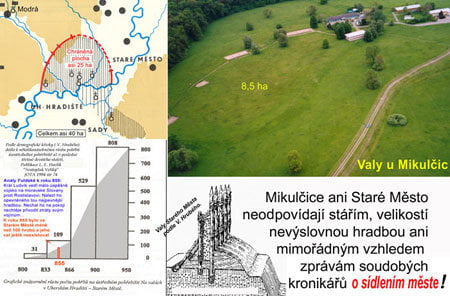 Znalezisko archeologiczne Mikulčice – Valy to największe słowiańskie znalezisko archeologiczne w Czechach. Znajduje się na wschód od gminy koło miejscowości Valy, w pobliżu słowackich granic. Od roku 1962 znalezisko jest Zabytkiem Kultury Narodowej i walczy o zapisanie na listę UNESCO. W roku 1963 wybudowano Pomnik Wielkich Moraw. Obszar był zasiedlony już w VII wieku. Stała tutaj znacząca siedziba Rzeszy Wielkomorawskiej. W IX wieku grodzisko zostało ufortyfikowane przy użyciu wałów. W latach późniejszych grodzisko staje się głównym centrum i siedzibą Wielkich Moraw. Zbudowano tu także fortece. W centrum obszaru znajdował się Akropolis, którego rozmiary określają pozostałości wałów. Odkryto tu fundamenty budowli o długości 25 m i szerokości 9 m. Zdaniem archeologów chodziło o pałac książęcy. Znaleziono tutaj także ślady po pracowniach, zabudowaniach, trójnawowym kościele i dalszych 11 kościołach. Odkryto ponad 2500 grobów. Znalezisko archeologiczna rozciąga się na powierzchni 10 ha. Przez obszar znaleziska prowadzi trasa ścieżki poznawczej z tablicami informacyjnymi i samodzielnym zwiedzaniem fundamentów kościołów i pałacu. Oprócz tego zbudowano tu dwa pawilony dla zwiedzających ze stałą ekspozycją odkryć archeologicznych.