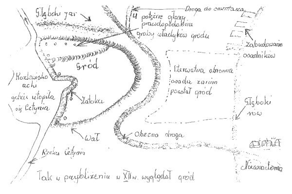 szkic grodziska z przyległa osadą rys. J.Pierzaka